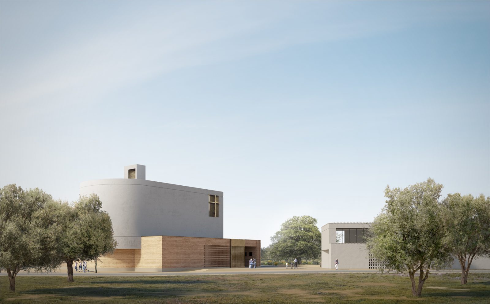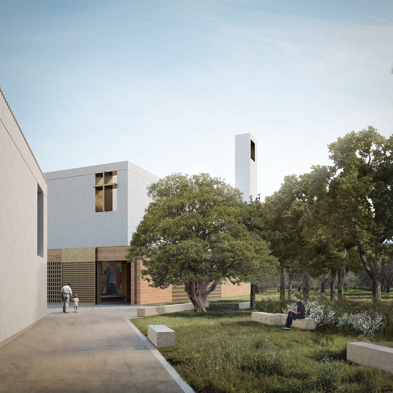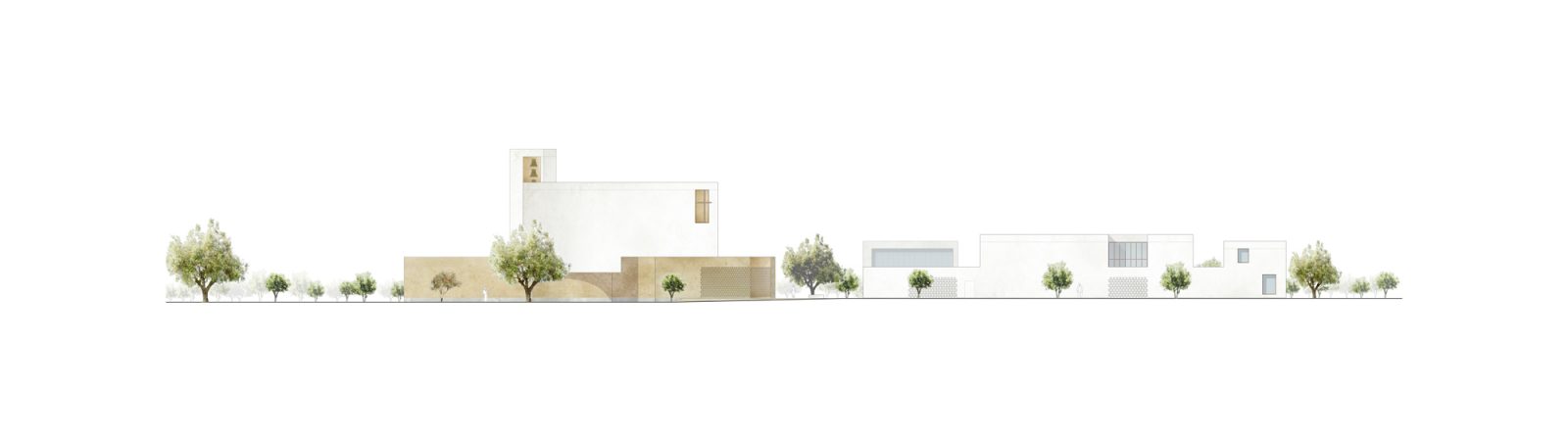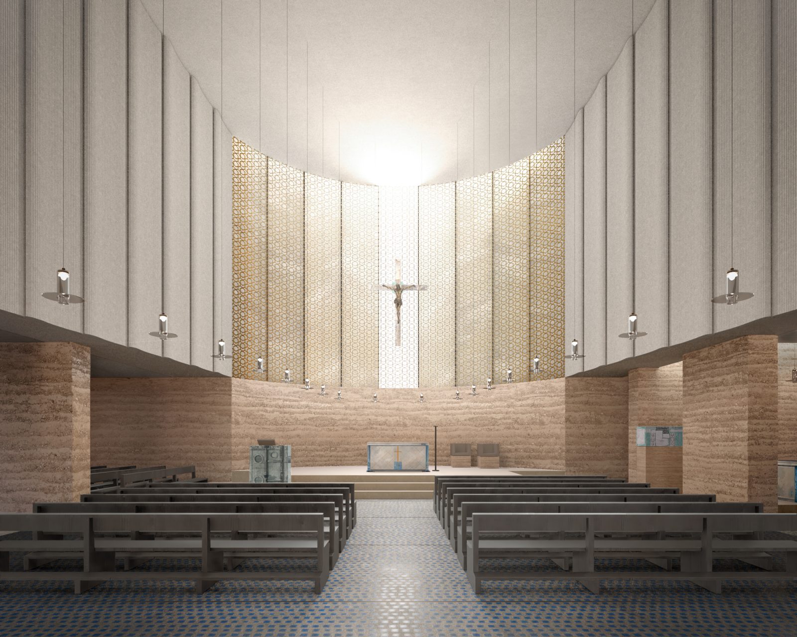 Una chiesa radicata nel terreno, un basamento in terra cruda pisé espressione del luogo, dove un’aula liturgica bianca si solleva innalzandosi, verticalmente, sopra il basamento, e protendendosi frontalmente con l’abside, testimonia il suo orientamento.