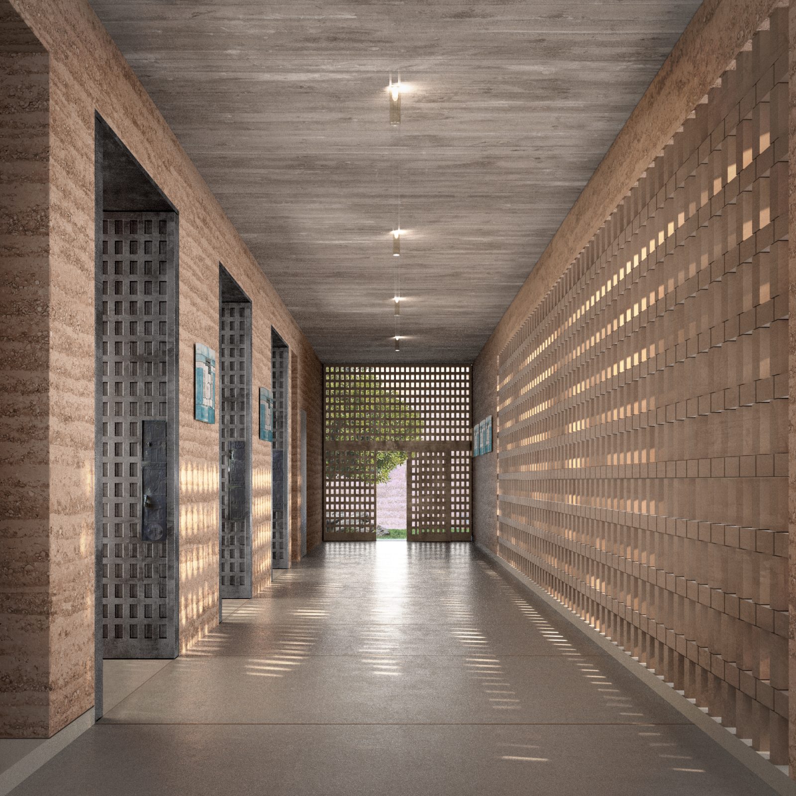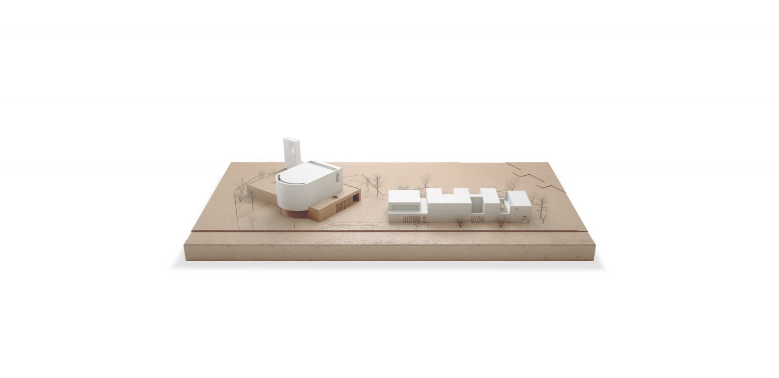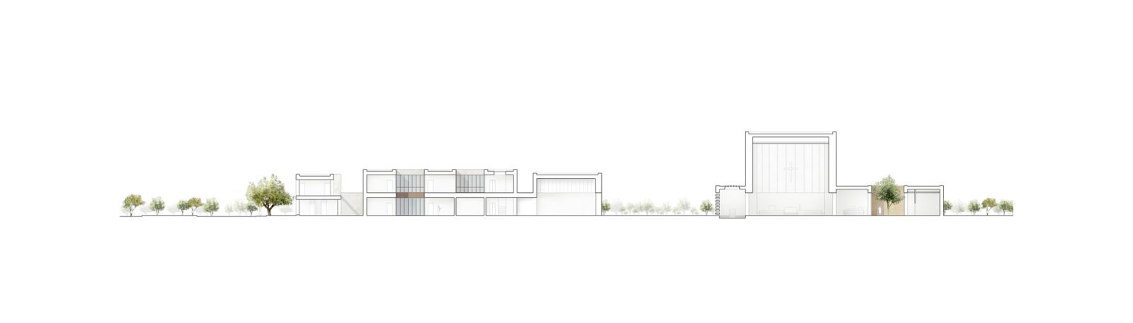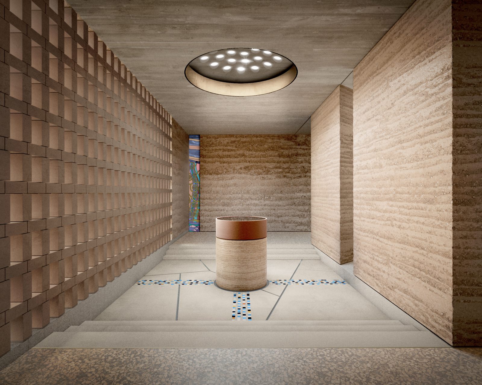 Una chiesa radicata nel terreno, un basamento in terra cruda pisé espressione del luogo, dove un’aula liturgica bianca si solleva innalzandosi, verticalmente, sopra il basamento, e protendendosi frontalmente con l’abside, testimonia il suo orientamento.