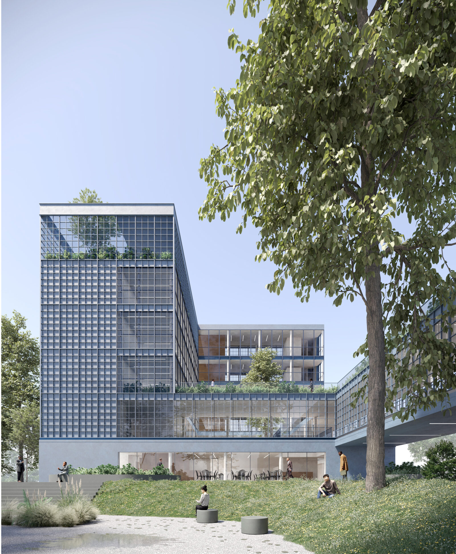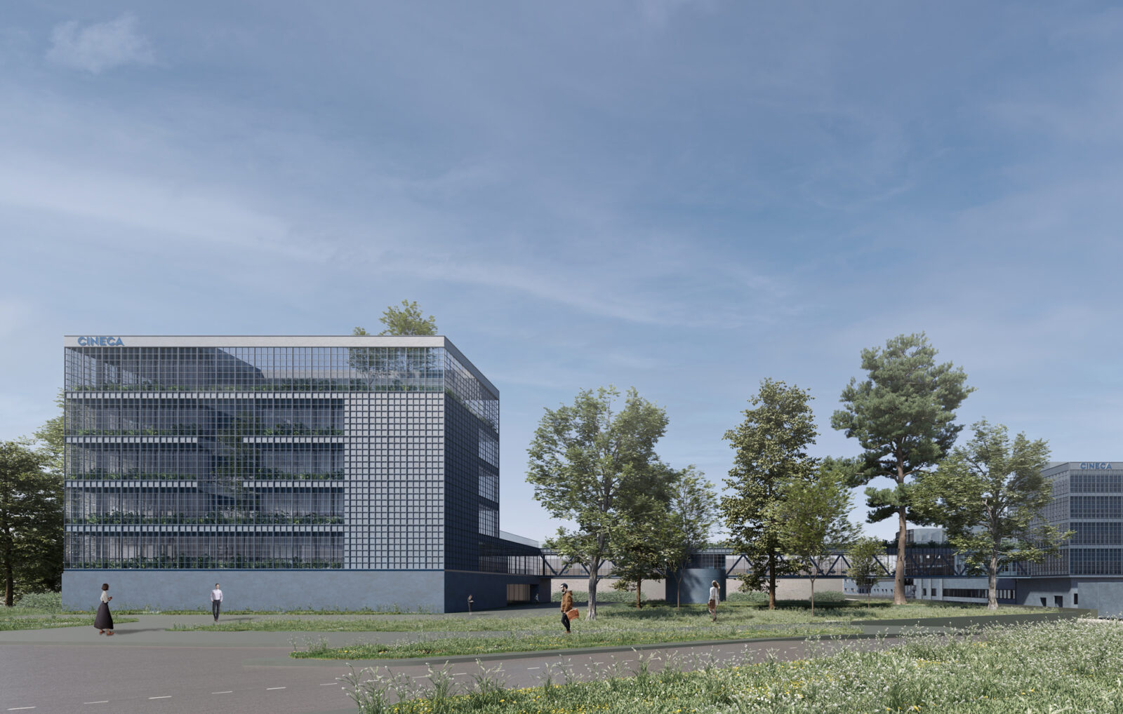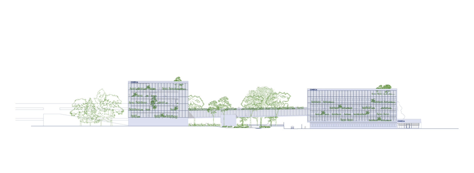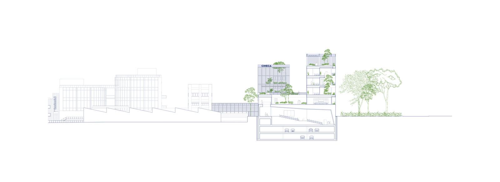 Il nuovo “Campus Cineca” si manifesta attraverso un’architettura iconica, razionale e sostenibile inserita all’interno di un nuovo parco ad uso dei dipendenti dell’intero Campus. La progettazione è stata guidata dall’idea di creare spazi condivisi e ambienti lavorativi innovativi. Un edificio direzionale moderno concepito tenendo conto delle esigenze delle persone, che si traducono in necessità legate allo spazio e al tempo. Il nuovo Campus si configura come una vera e propria infrastruttura blu/verde articolata su più livelli, dal piano terra – dove il nuovo parco car free si pone in continuità con le strade di quartiere – alle terrazze in quota, dove si configurano spazi più “privati”. Il verde penetra l’edificio attraverso l’involucro a doppio pelle dell’edificio, all’interno del quale piante autoctone trovano ideale luogo di crescita.