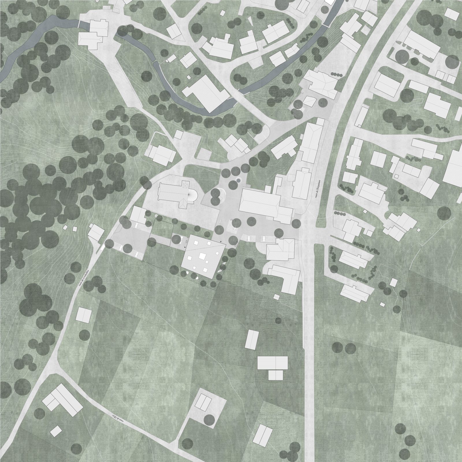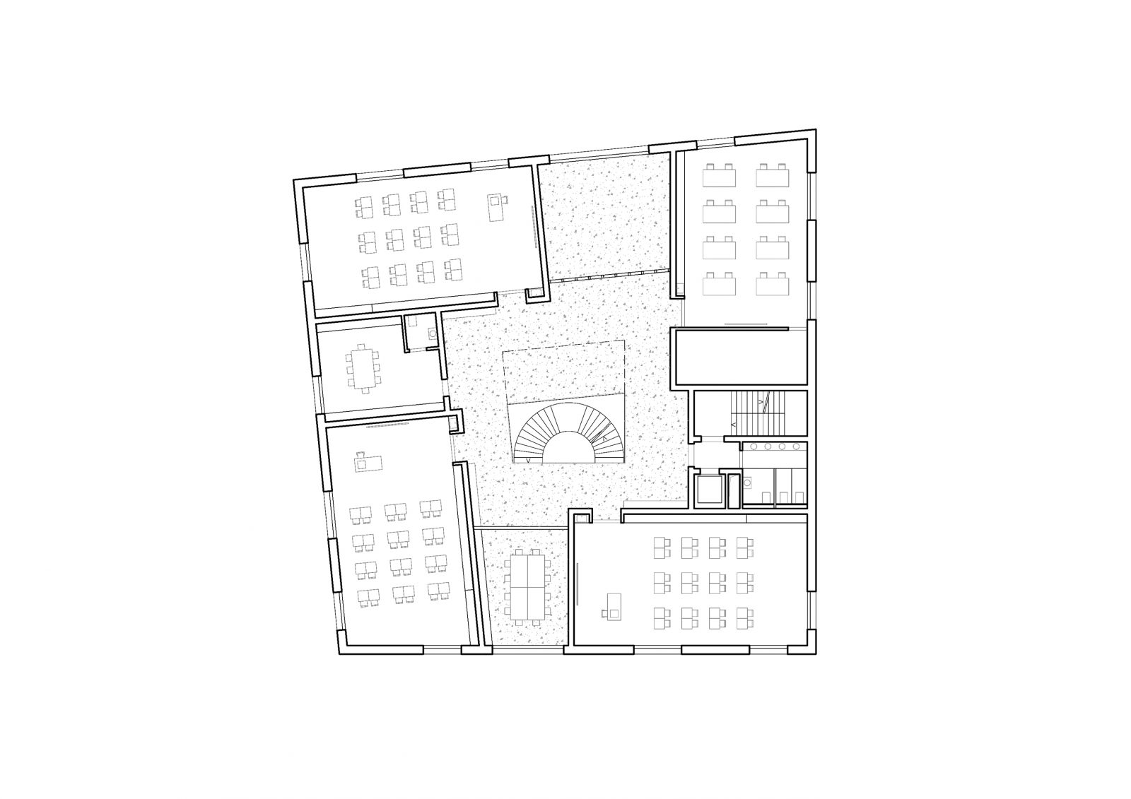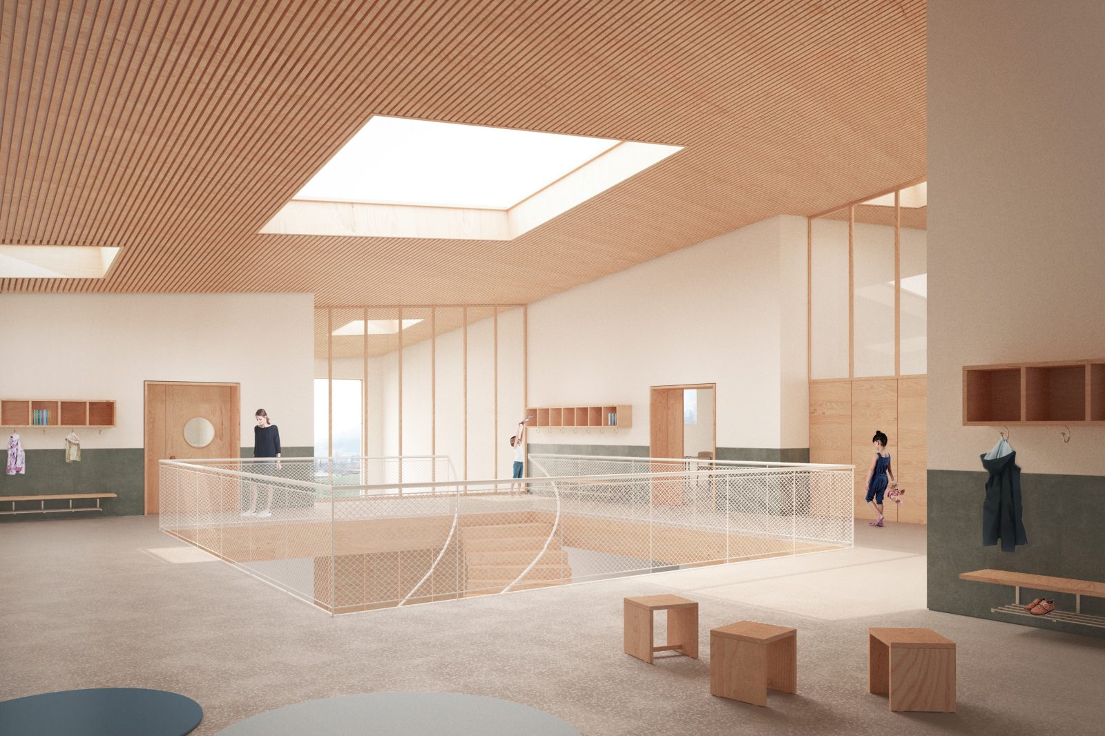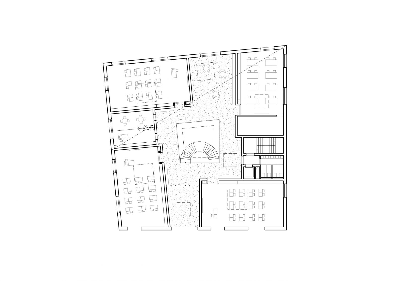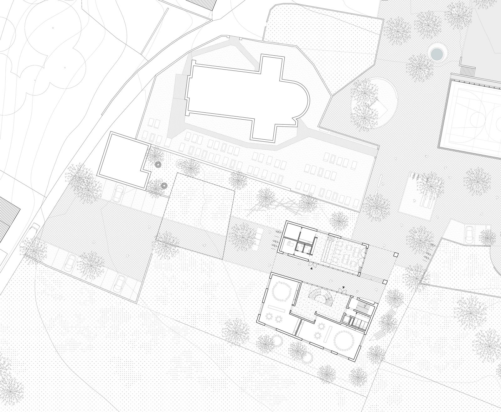 La volumetria è generata dai flussi che interessano l’area, a cui viene lasciata completa permeabilità. Il corpo di fabbrica viene così svuotato per permettere il passaggio e la connessione tra le parti; il tetto si alza e si inclina ad indicare gli accessi, permettendo di integrarsi in maniera armonica nel contesto circostante.