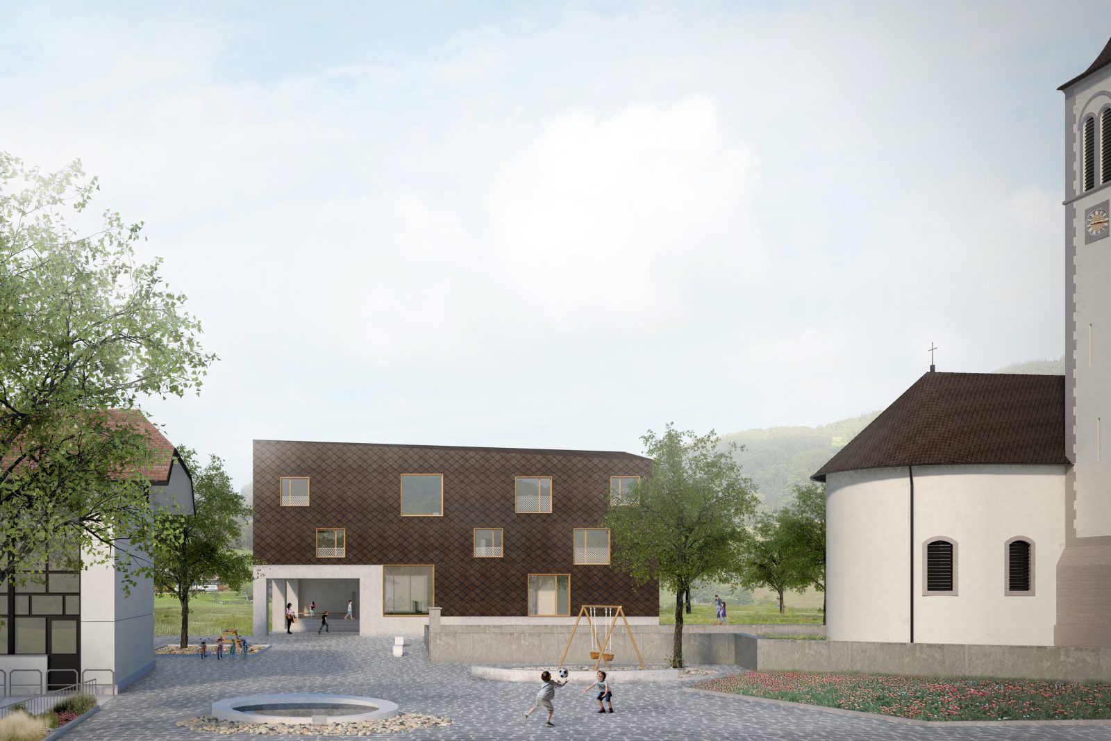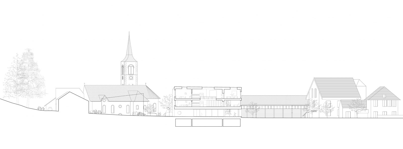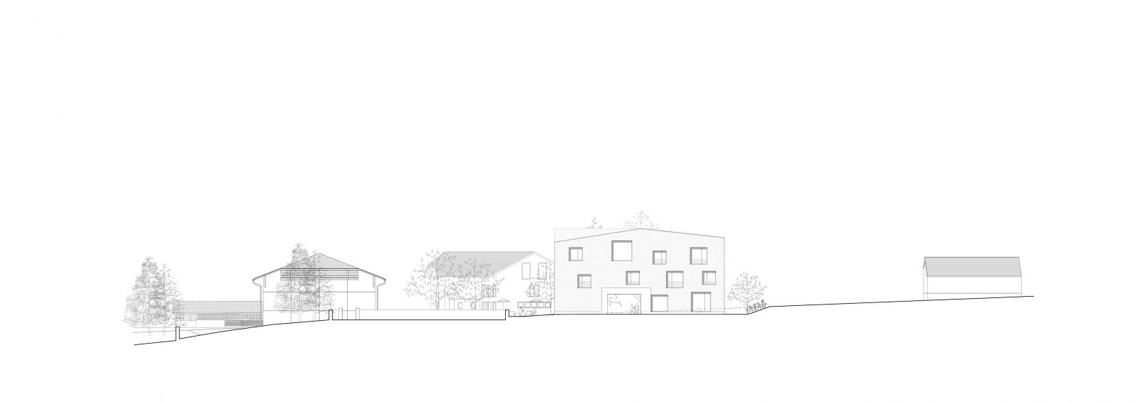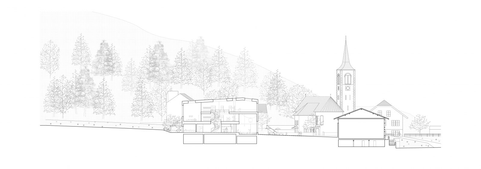La scuola si configura come edificio parallelepipedo compatto, la cui base, iscritta in un quadrato, asseconda i limiti dell’area di progetto e le visuali dei principali punti di osservazione, ispirandosi nelle forme e nella giacitura all’architettura vernacolare del luogo.