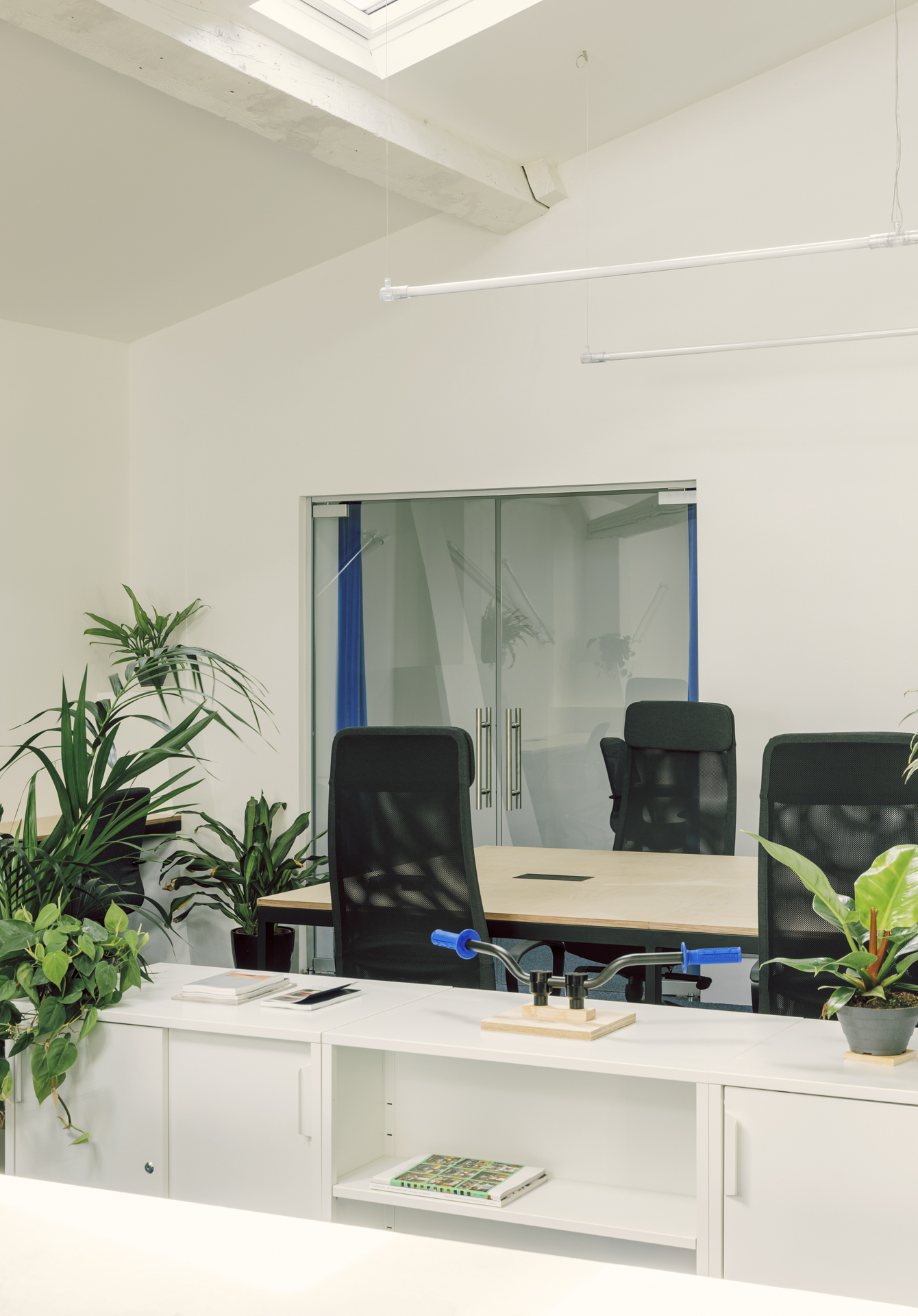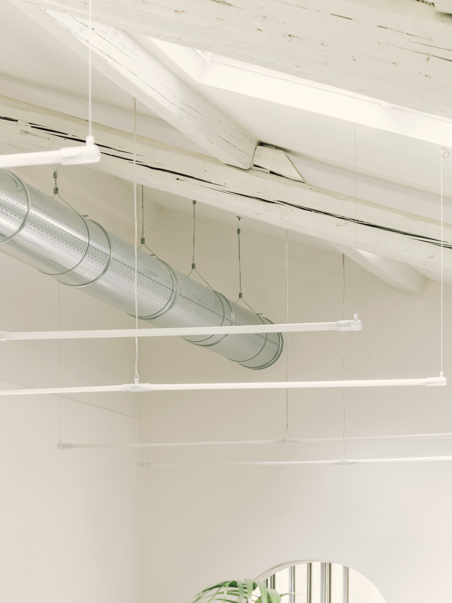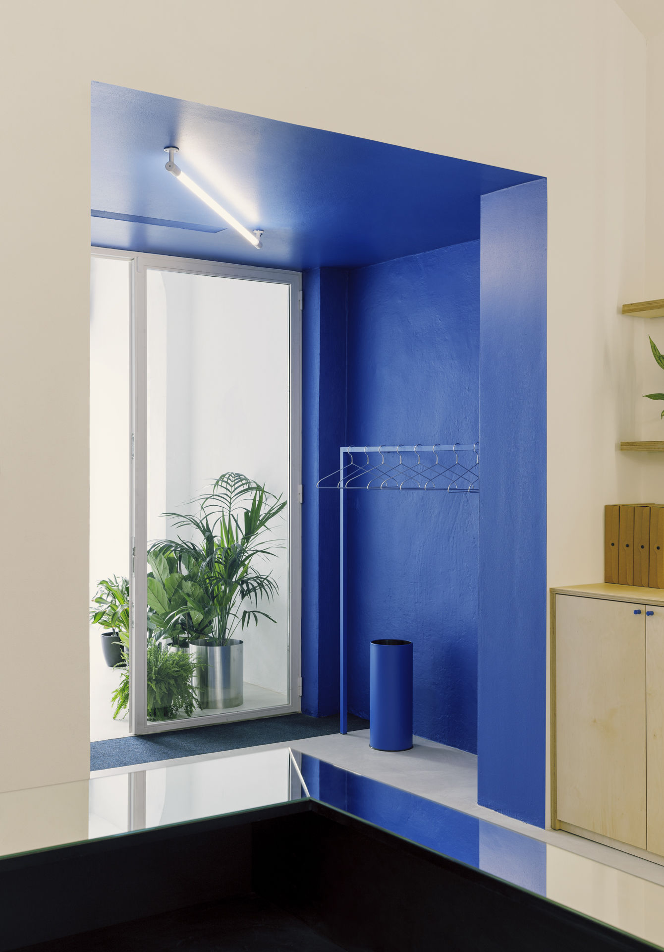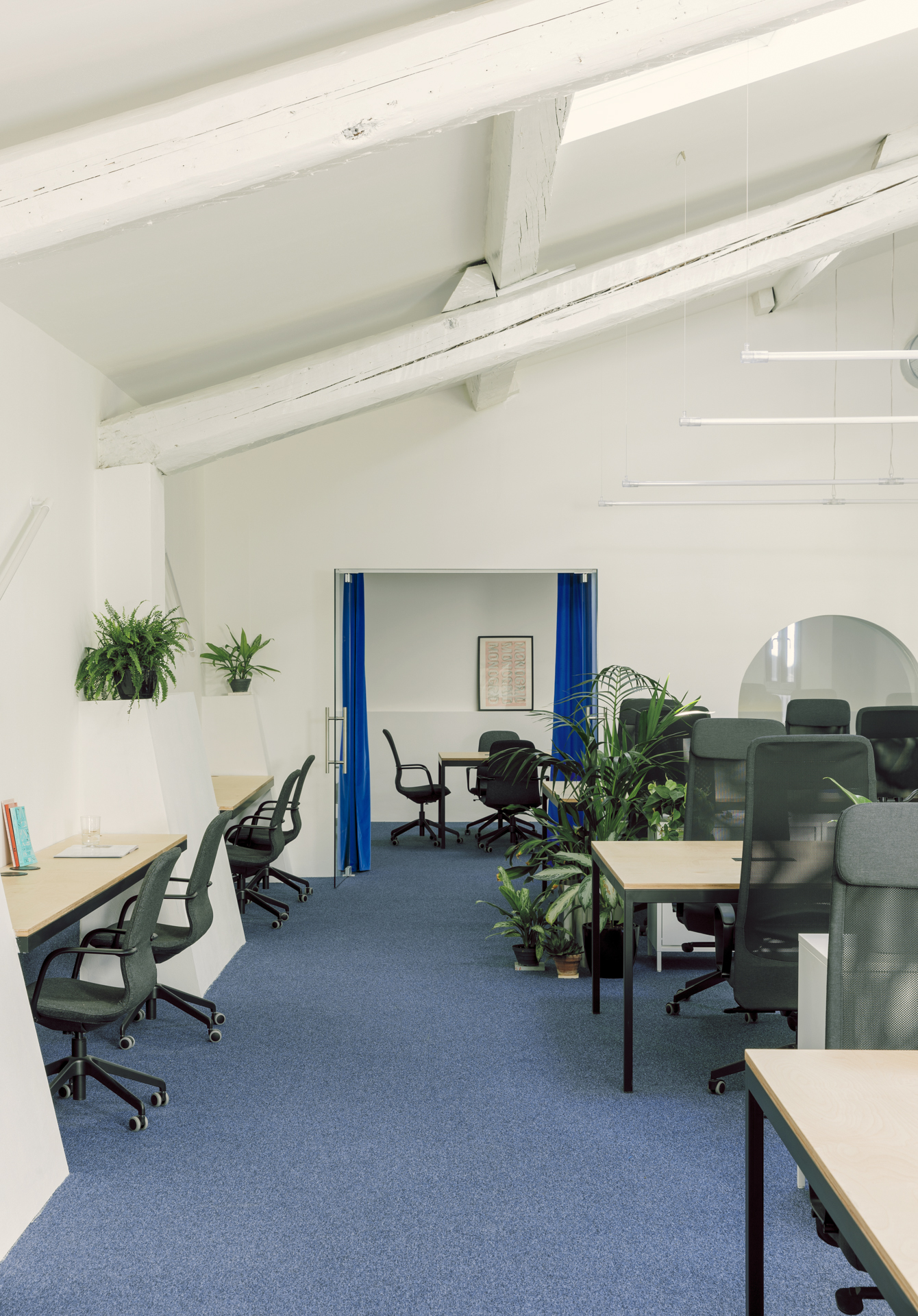 Gli uffici, distinti volumetricamente, sono illuminati da luce zenitale diffusa proveniente dalla copertura a falda. La pavimentazione in moquette, gli arredi in ferro e multistrato di betulla e l’illuminazione artificiale conferiscono agli spazi un’atmosfera calma e confortevole, perfetta per stimolare la produttività e il benessere dei dipendenti.