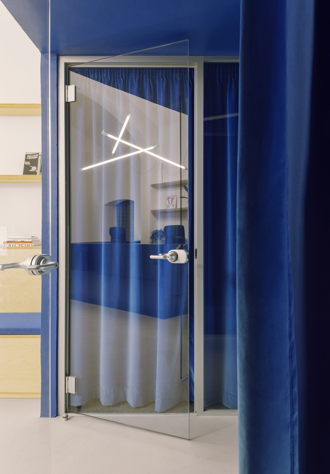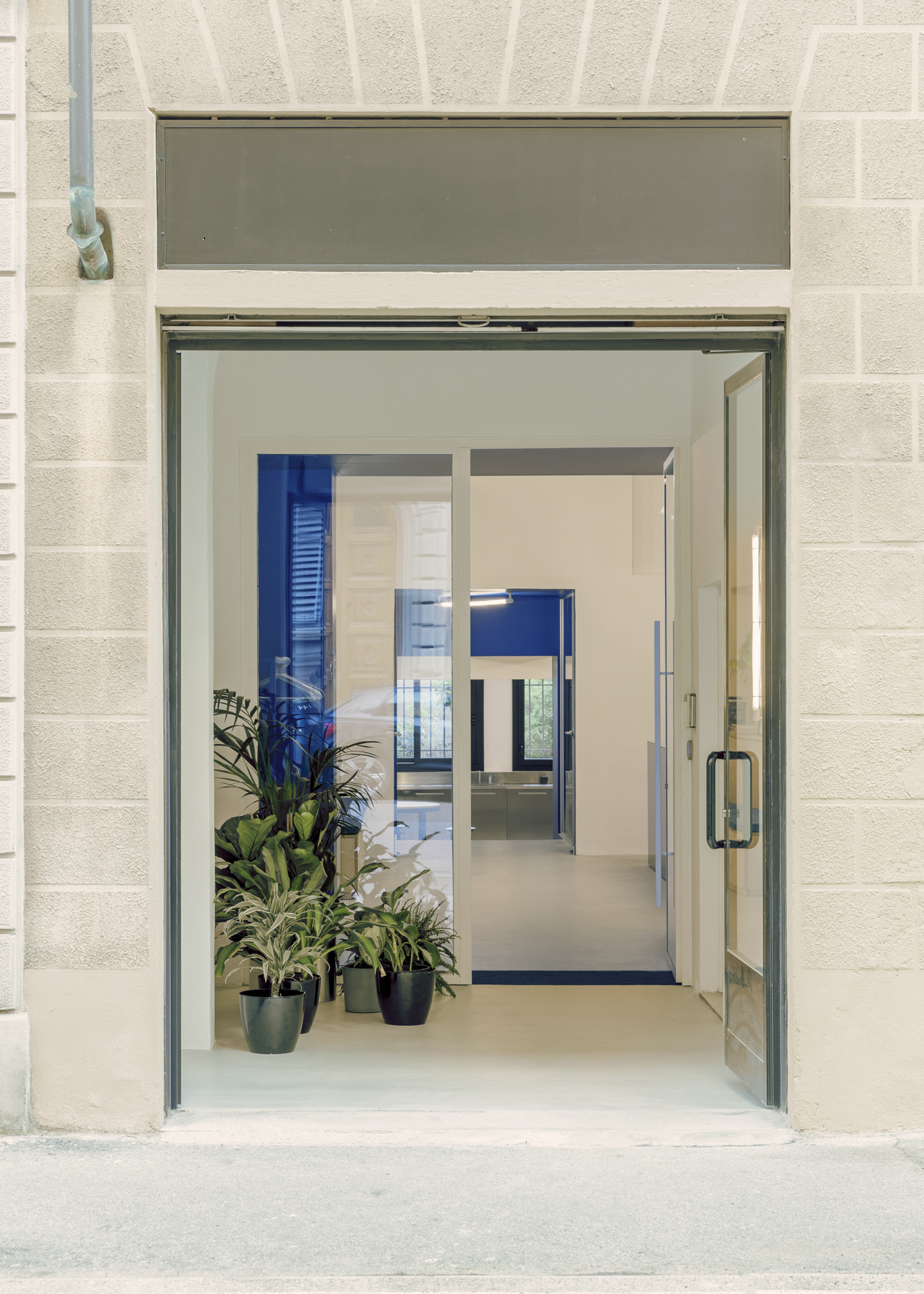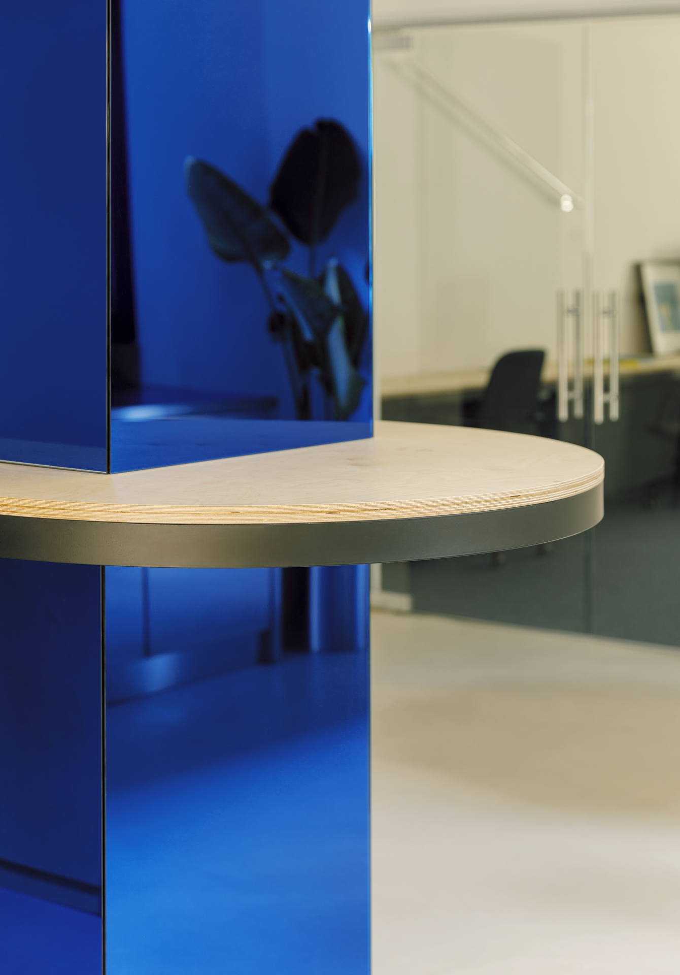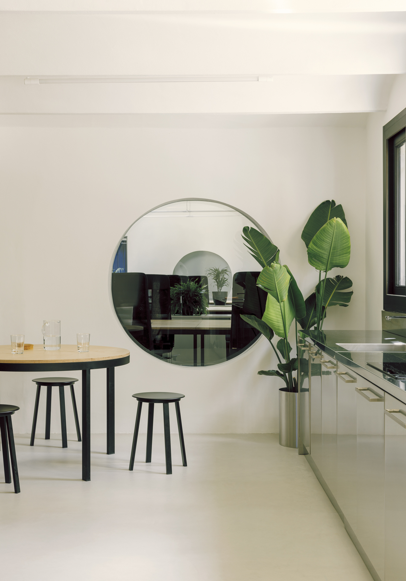 L’ingresso accoglie i visitatori e li indirizza, attraverso una breve rampa di scale, allo spazio ricreativo dell’ufficio, punto centrale sia dal punto di vista funzionale che distributivo. Una serie di aperture circolari collega visivamente le diverse sezioni dell’ufficio, creando un gioco di rimbalzi visuali tra elementi in acciaio satinato, superfici specchianti, microcemento e superfici smaltate con i colori aziendali.