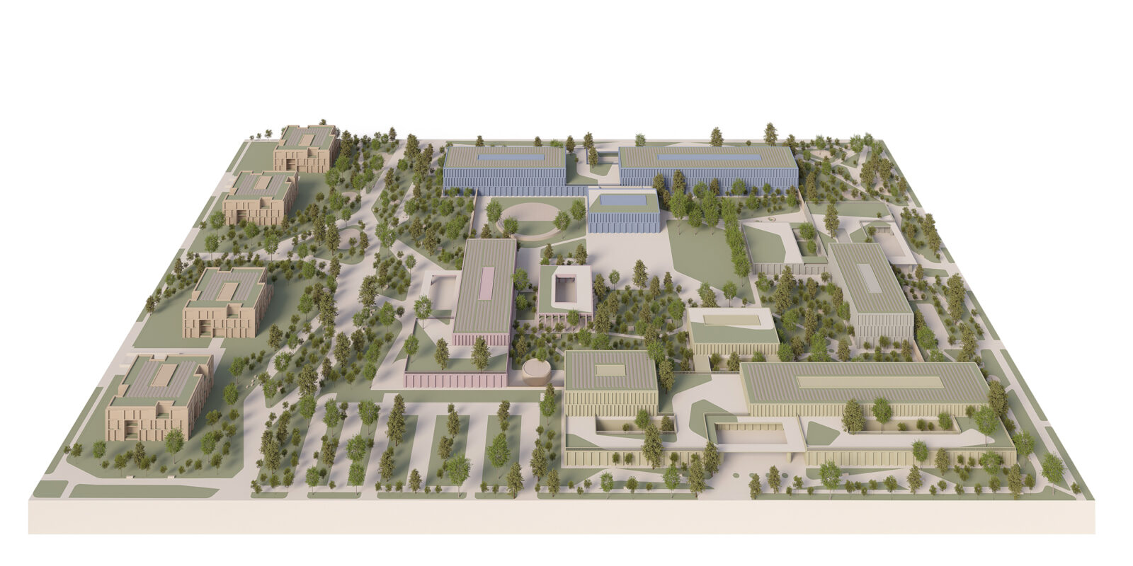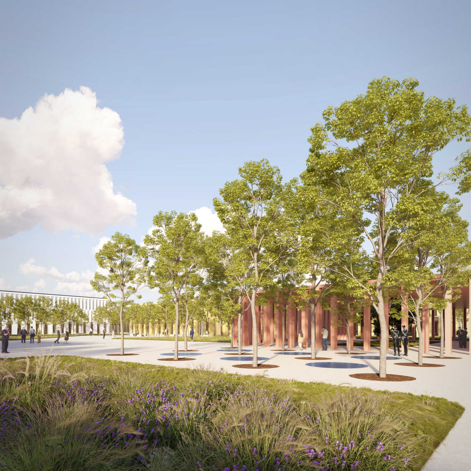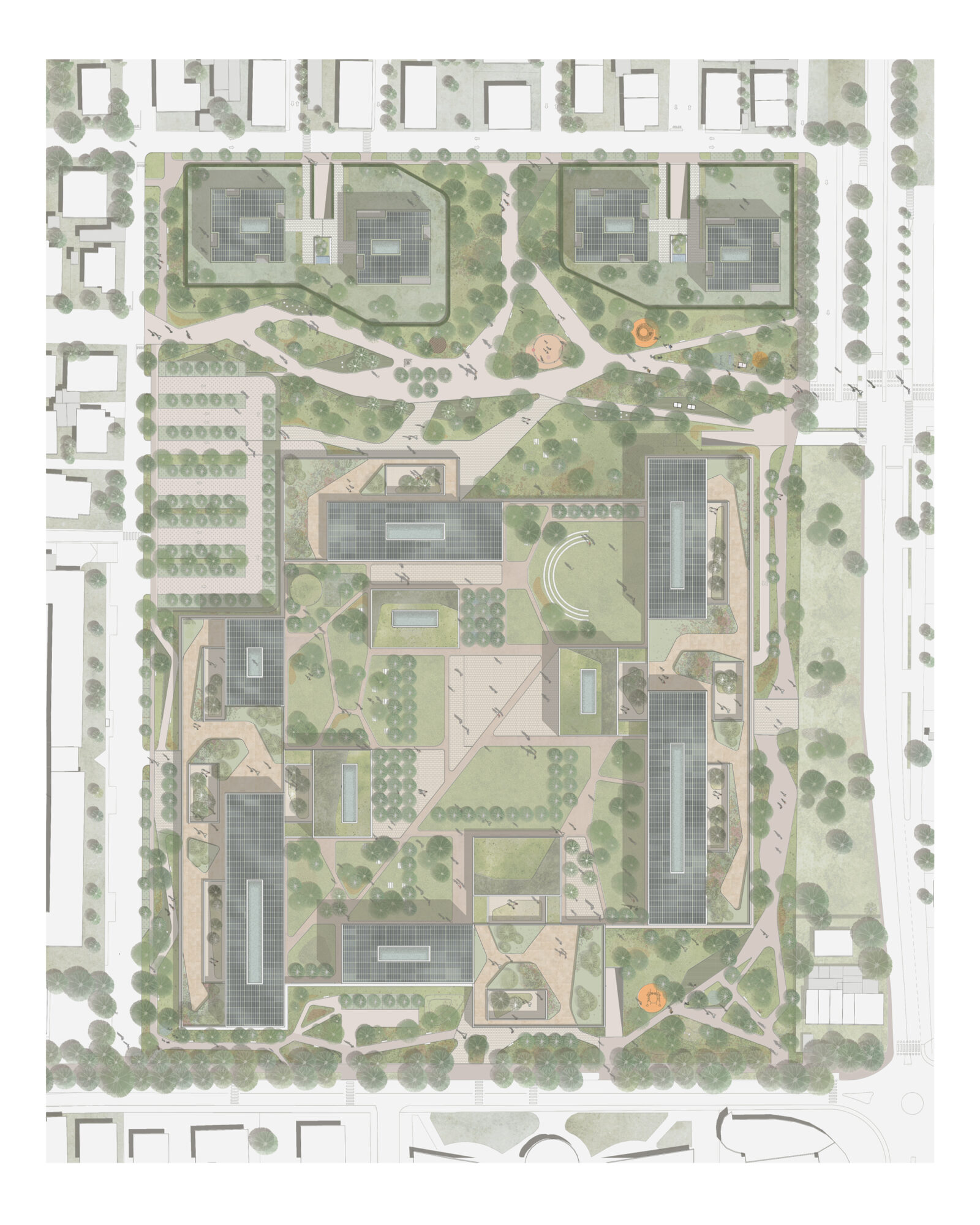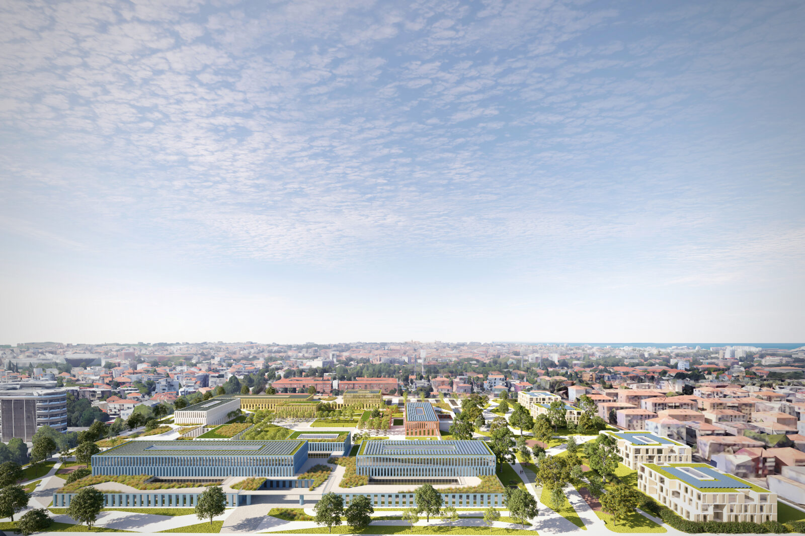 Il progetto della Nuova Cittadella della Sicurezza di Rimini trasforma un’area demaniale dismessa in un polo multifunzionale organizzato attorno a un “quadrilatero amministrativo”. L’impianto architettonico si basa su un quadrato di 195 metri di lato che accoglie quattro edifici indipendenti (Prefettura, Guardia di Finanza, Carabinieri e Polizia di Stato), disposti in modo da creare un perimetro “zigzagante” che rompe la rigidità del confine urbano. Le strutture, con un’altezza variabile da uno a tre piani, adottano forme stereotomiche a “T” per ottimizzare la distribuzione interna e ridurre i percorsi orizzontali. Un elemento distintivo è l’involucro edilizio, realizzato con un sistema prefabbricato in lastre di calcestruzzo facciavista riciclato; ogni edificio presenta una colorazione differente per favorirne la riconoscibilità istituzionale. Ampie terrazze inverdite sulle coperture migliorano il microclima e la qualità degli spazi di lavoro. Al centro del complesso, il “cortile” funge da ecosistema protetto per funzioni comuni come l’auditorium e la mensa. A nord, quattro volumi residenziali coordinati completano l’intervento, integrandosi con il tessuto urbano preesistente.