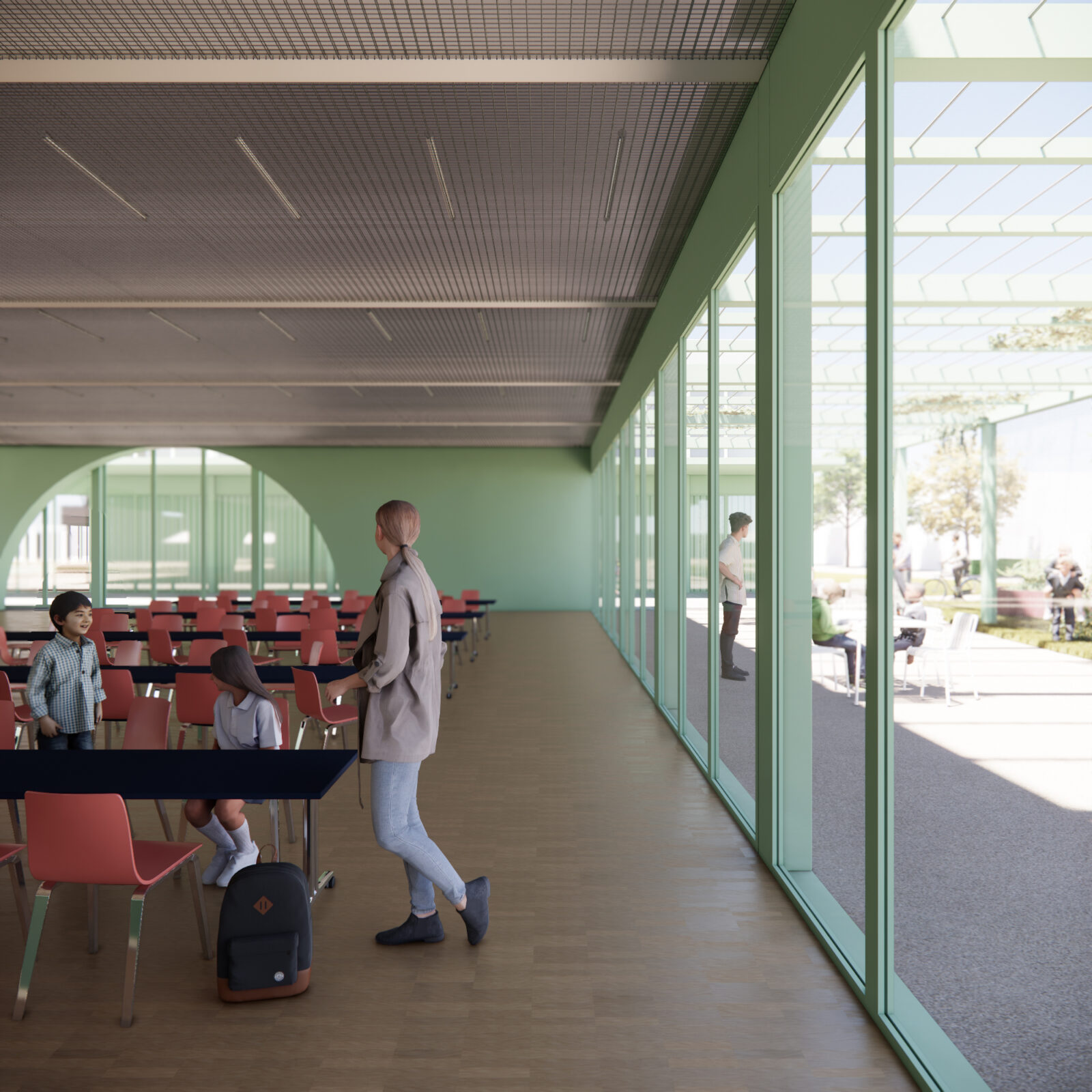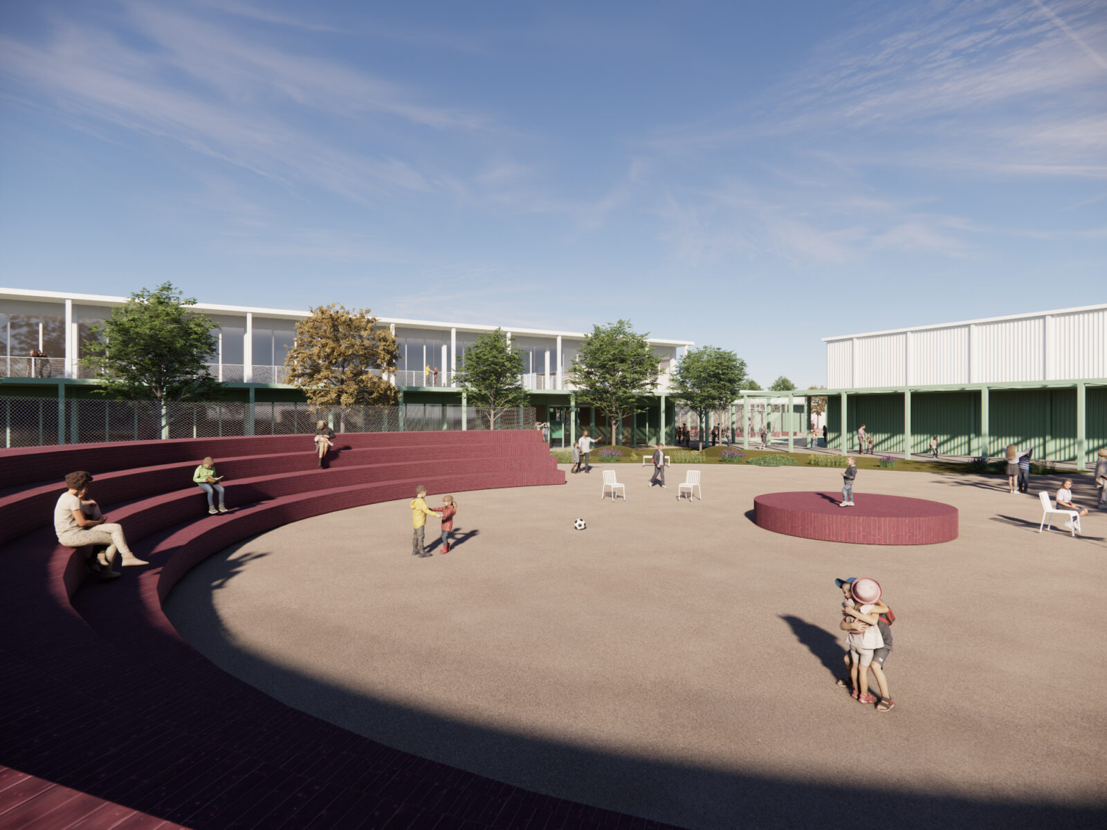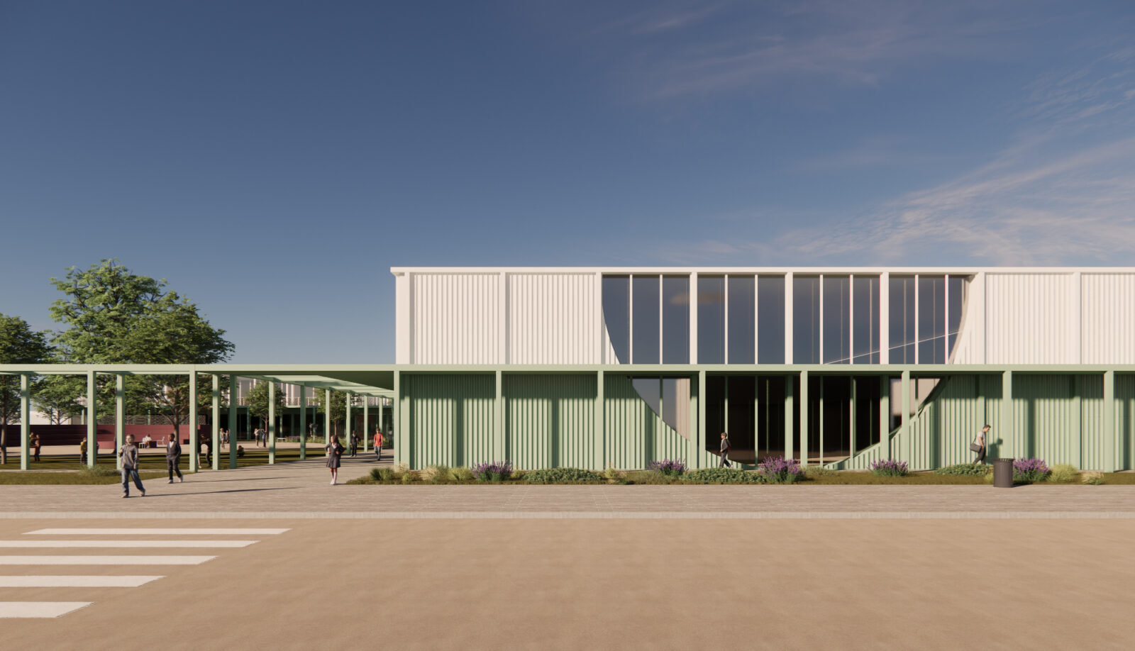 L’immagine del nuovo complesso scolastico è affidata a una composizione volumetrica modulare realizzata tramite l’uso del metallo come struttura e finitura esterna, un sistema  costruttivo rapido, a secco e basso impatto ambientale. Le volumetrie sono caratterizzate cromaticamente da una piastra basamentale in colore verde chiaro sormontata da volumi bianchi. Moduli di facciata opachi e trasparenti si alternano, differentemente ritmati a seconda delle funzioni, mentre grandi aperture semicircolari inquadrano gli accessi e le visuali prevalenti degli edifici. I percorsi, rimarcati dalla presenza di una pergola leggera, tengono uniti tutti gli edifici del complesso e garantiscono l’attraversamento protetto del lotto.