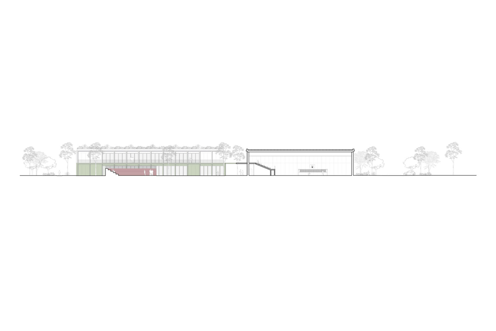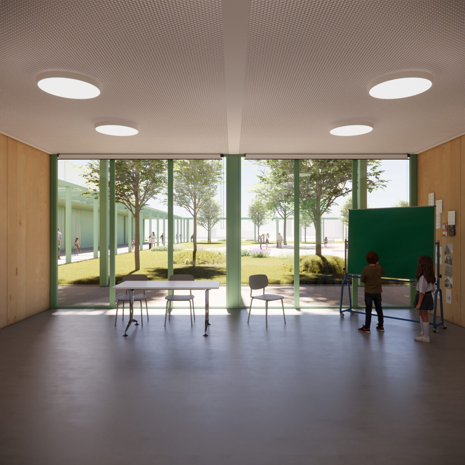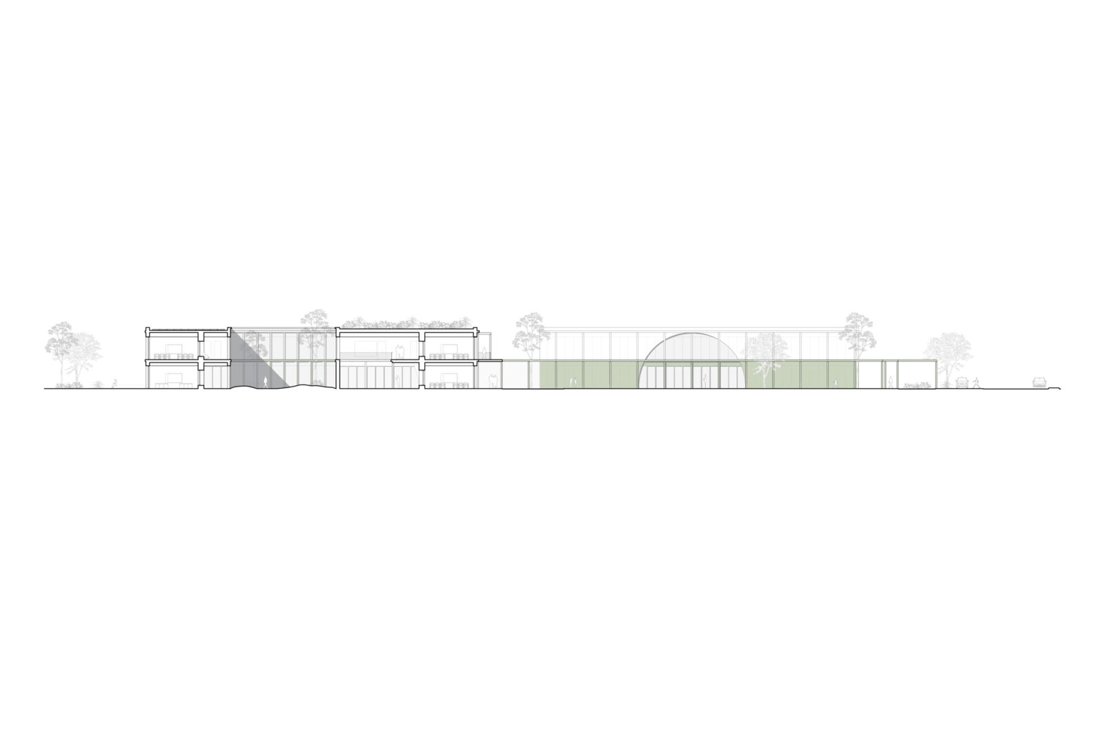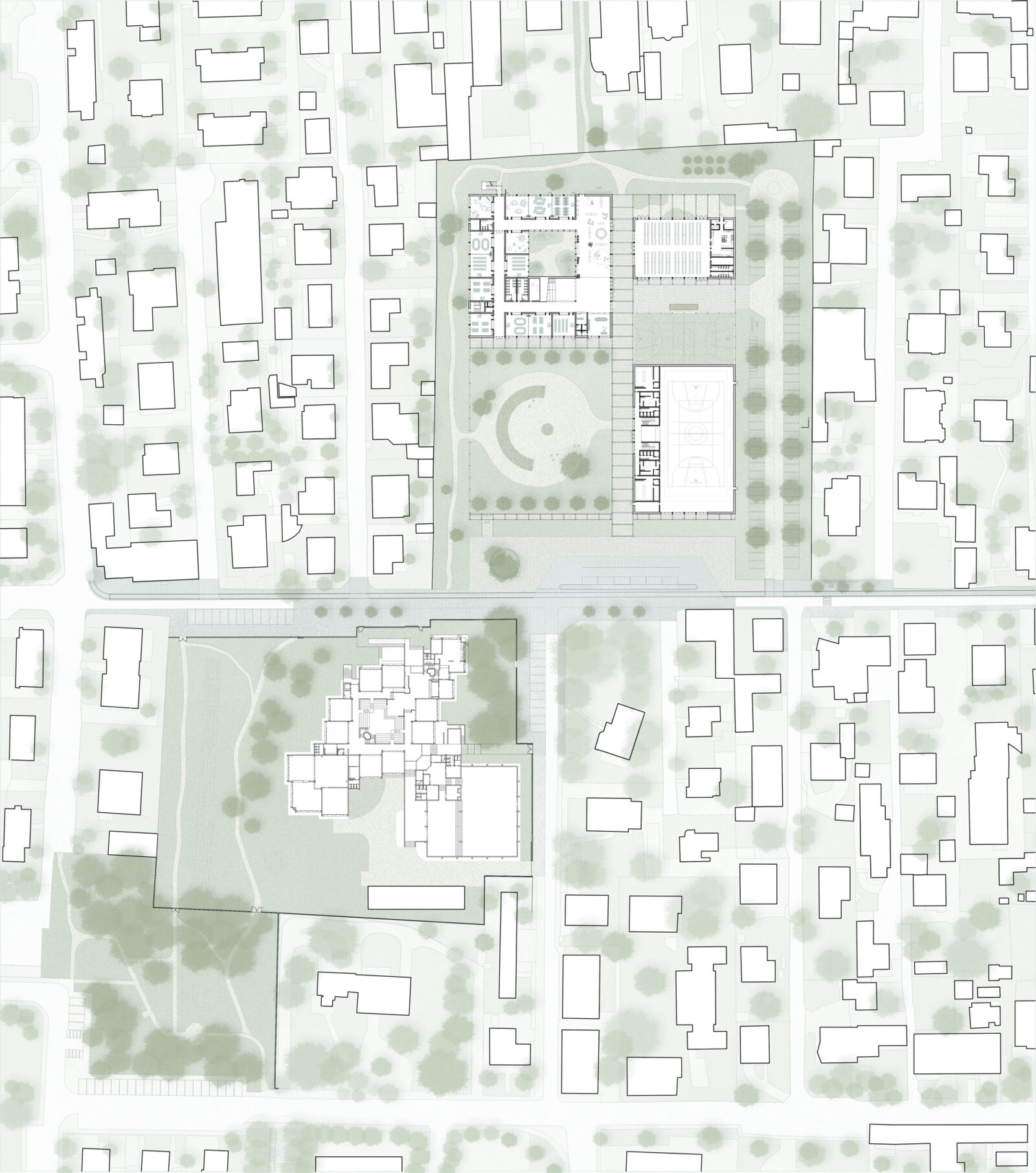L’immagine del nuovo complesso scolastico è affidata a una composizione volumetrica modulare realizzata tramite l’uso del metallo come struttura e finitura esterna, un sistema  costruttivo rapido, a secco e basso impatto ambientale. Le volumetrie sono caratterizzate cromaticamente da una piastra basamentale in colore verde chiaro sormontata da volumi bianchi. Moduli di facciata opachi e trasparenti si alternano, differentemente ritmati a seconda delle funzioni, mentre grandi aperture semicircolari inquadrano gli accessi e le visuali prevalenti degli edifici. I percorsi, rimarcati dalla presenza di una pergola leggera, tengono uniti tutti gli edifici del complesso e garantiscono l’attraversamento protetto del lotto.