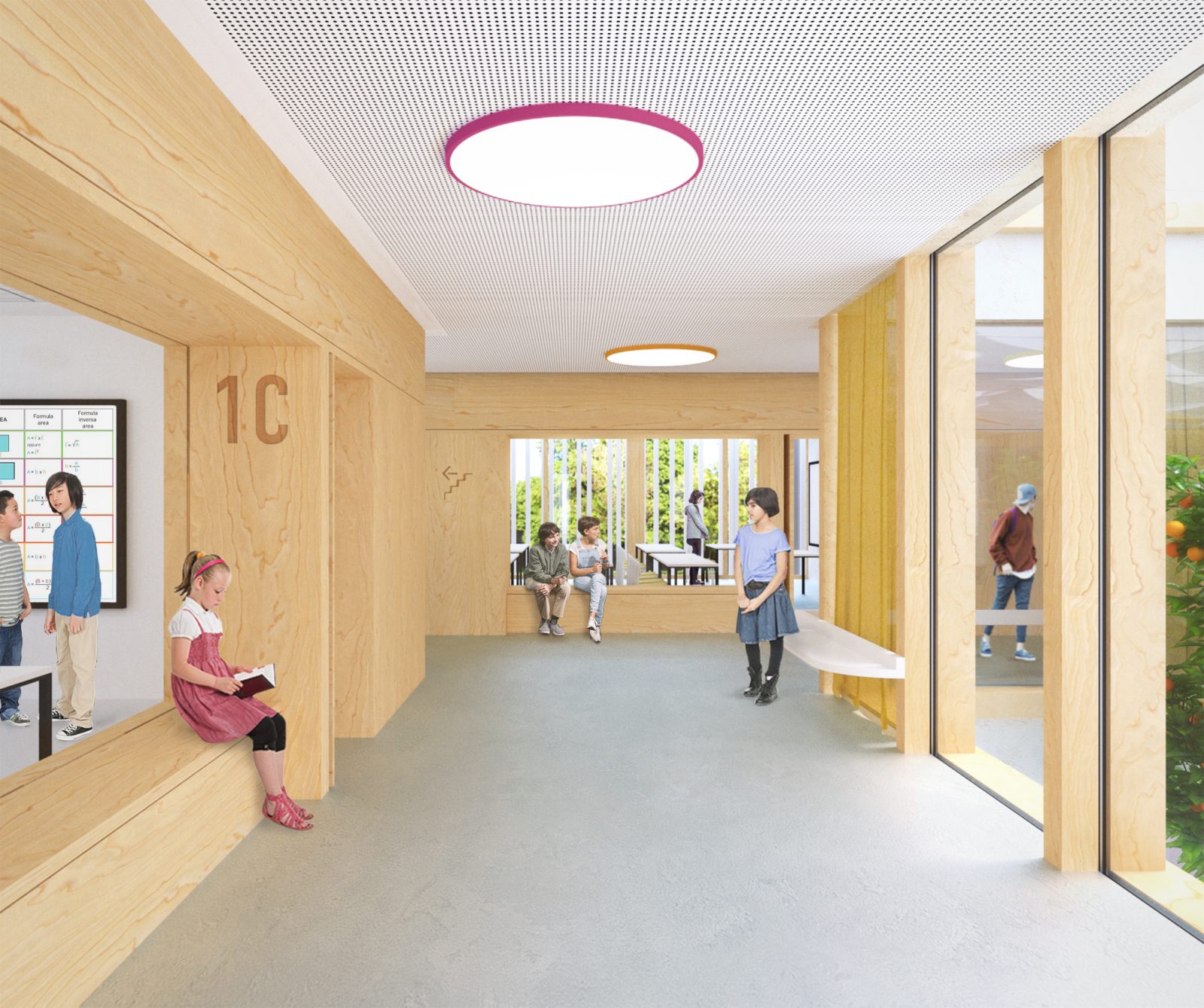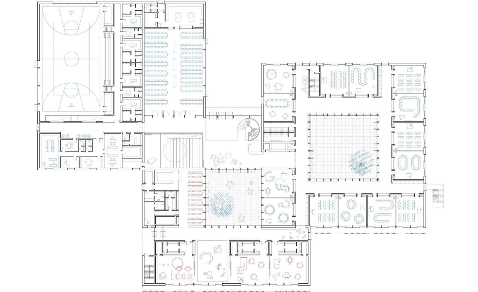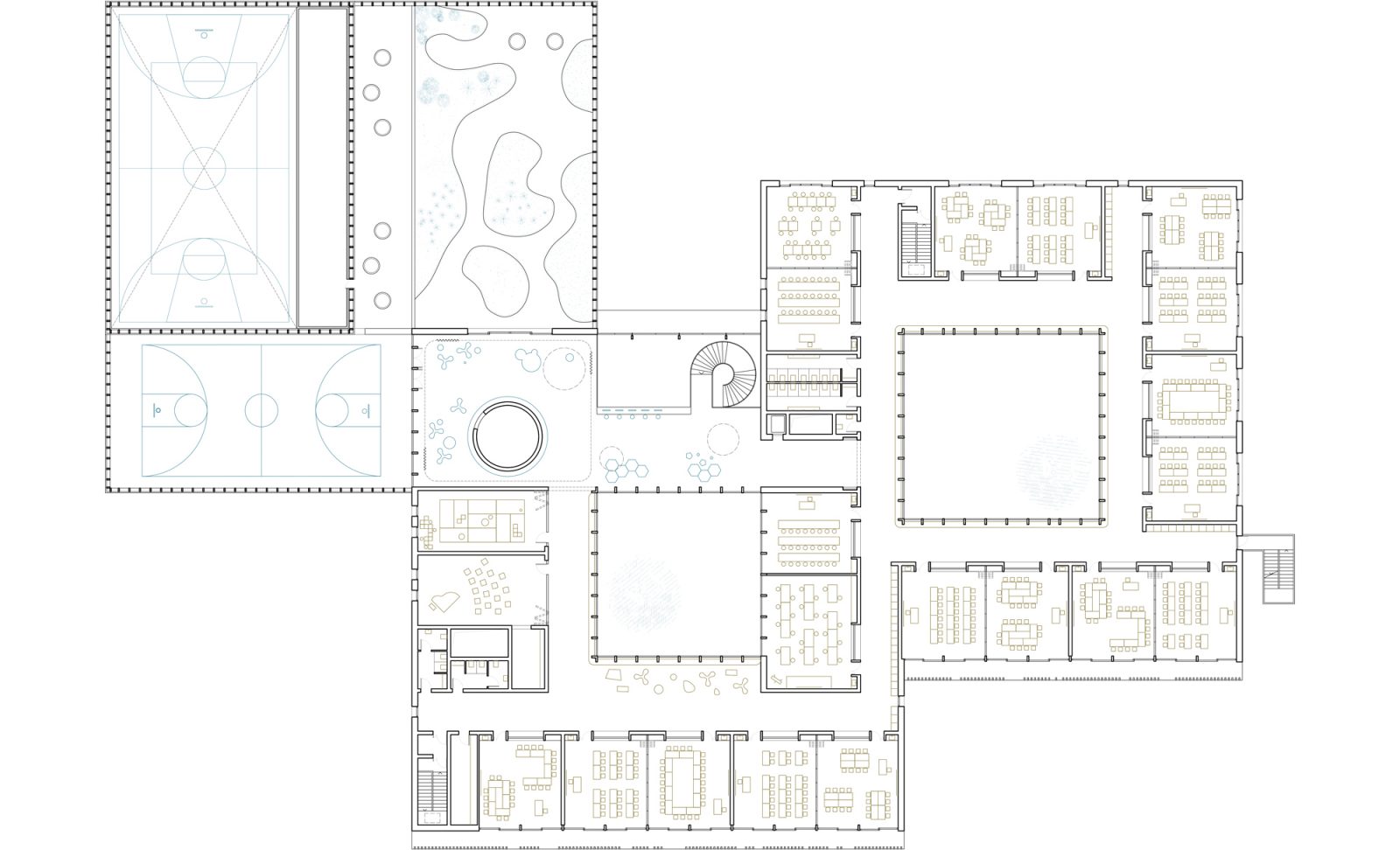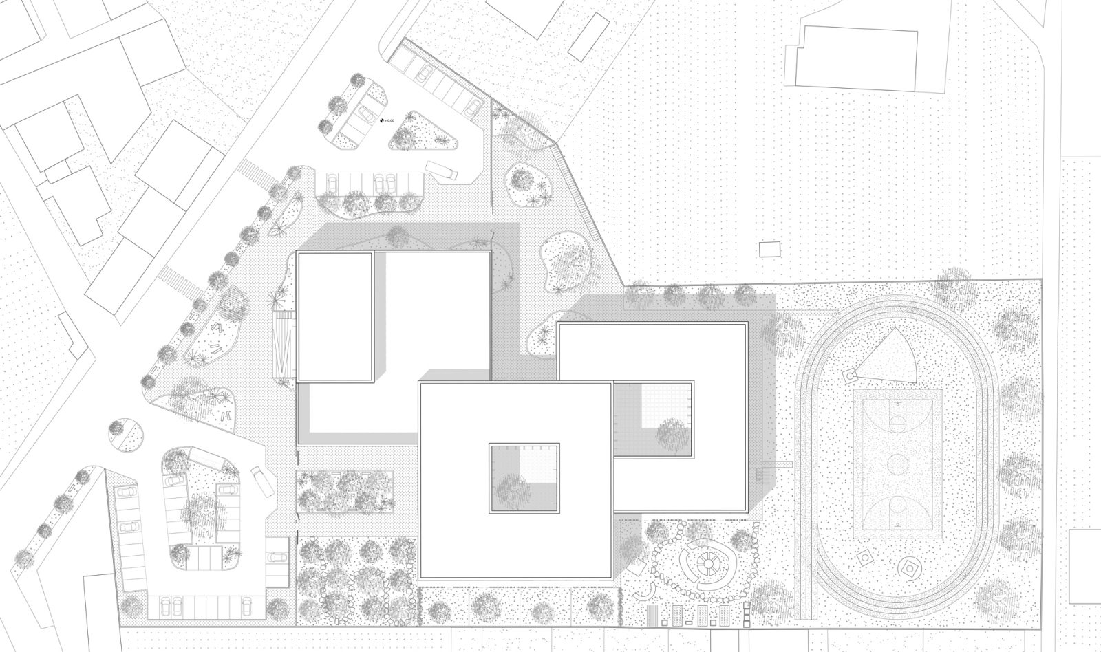 Due dei tre volumi sono svuotati da corti aperte al cielo, attorno alle quali si articolano, al piano terra, gli spazi della scuola dell’infanzia ed elementare e, al piano primo, della scuola media; il terzo quadrato ospita, alla quota d’accesso, le funzioni collettive (mensa, palestra con relativi servizi e area amministrativa), mentre alla quota del primo livello si trovano un campo da gioco e un giardino didattico a cielo aperto.