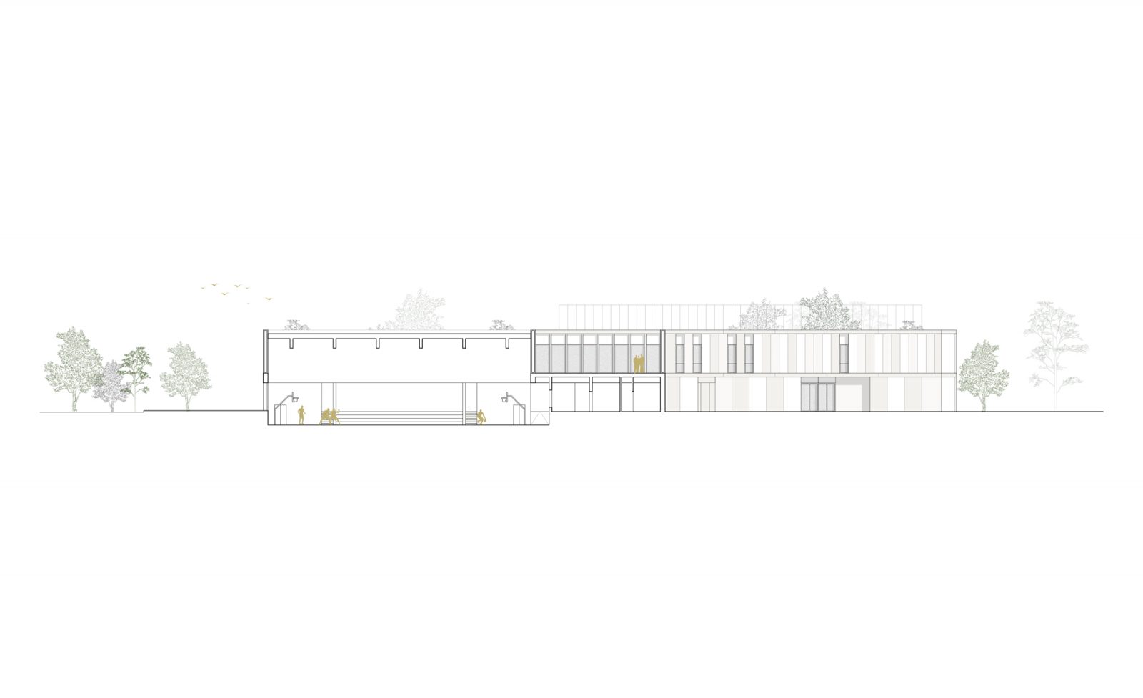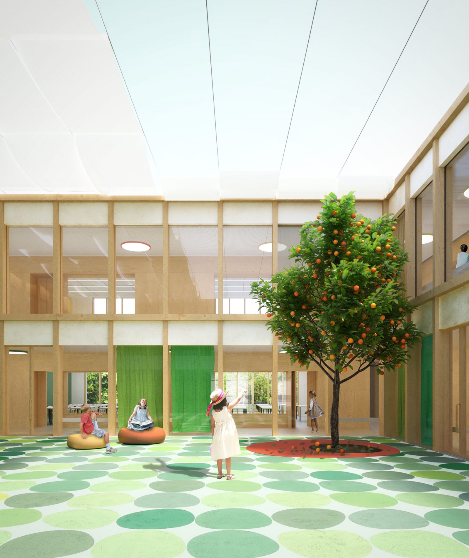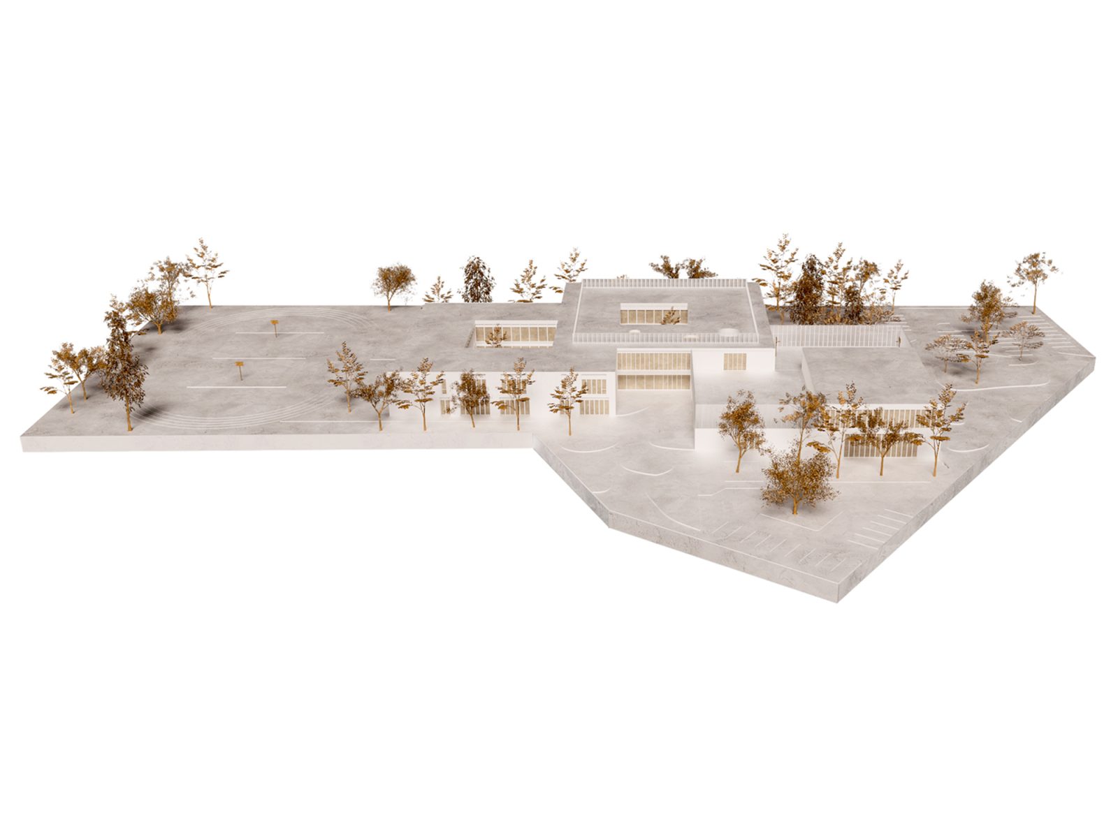 Due dei tre volumi sono svuotati da corti aperte al cielo, attorno alle quali si articolano, al piano terra, gli spazi della scuola dell’infanzia ed elementare e, al piano primo, della scuola media; il terzo quadrato ospita, alla quota d’accesso, le funzioni collettive (mensa, palestra con relativi servizi e area amministrativa), mentre alla quota del primo livello si trovano un campo da gioco e un giardino didattico a cielo aperto.