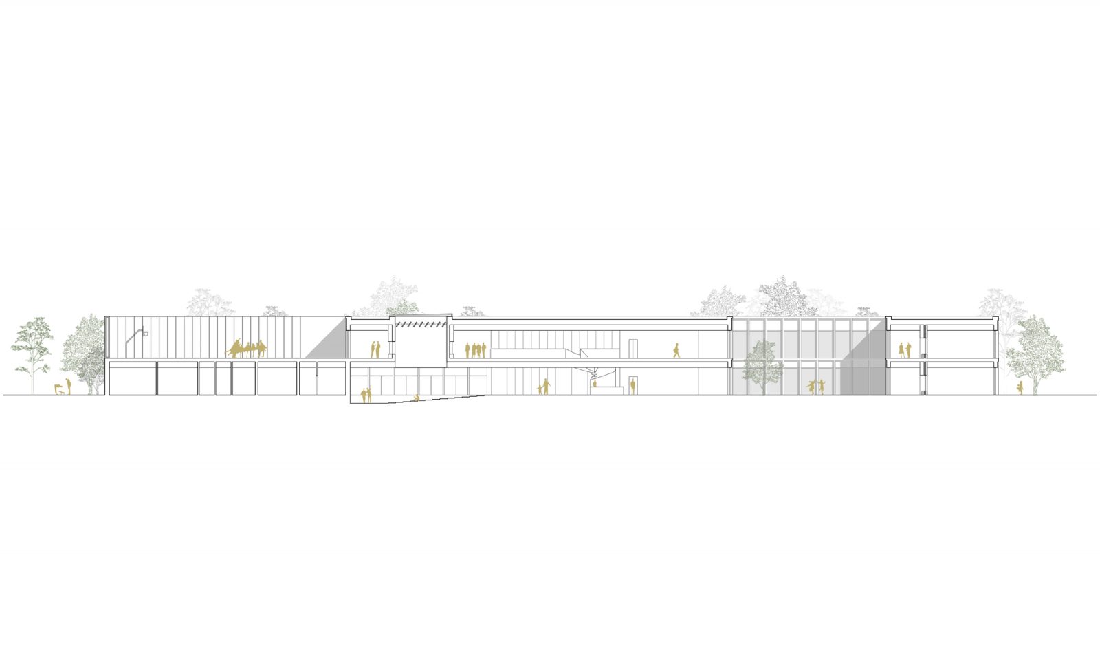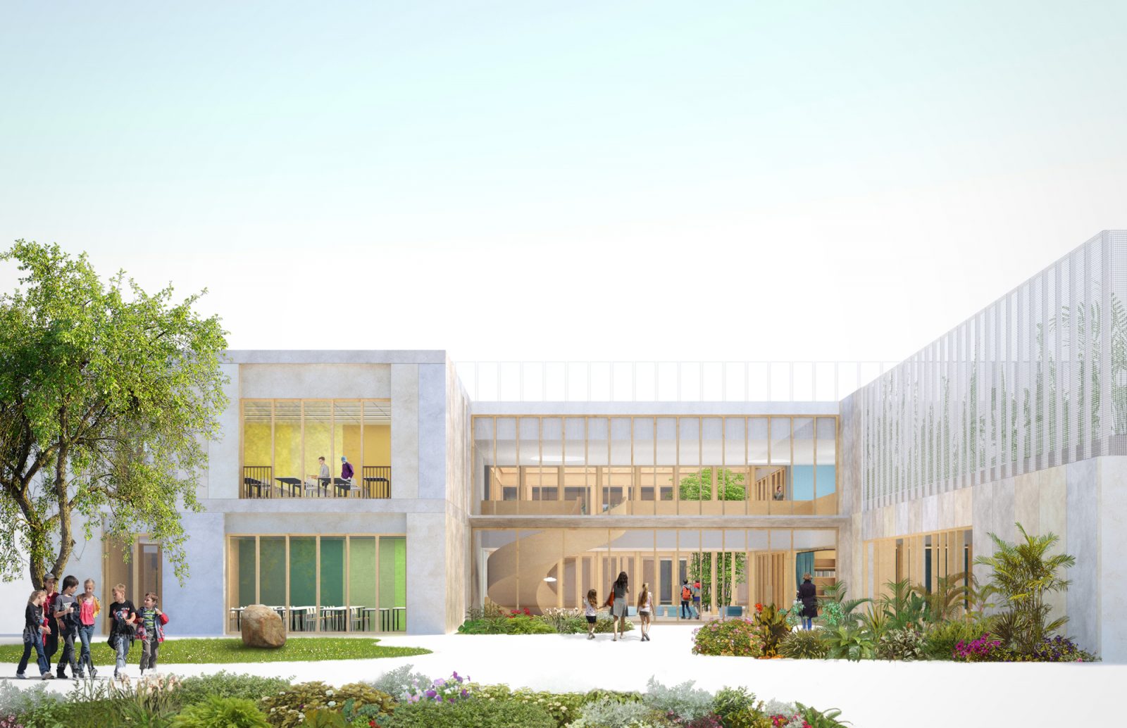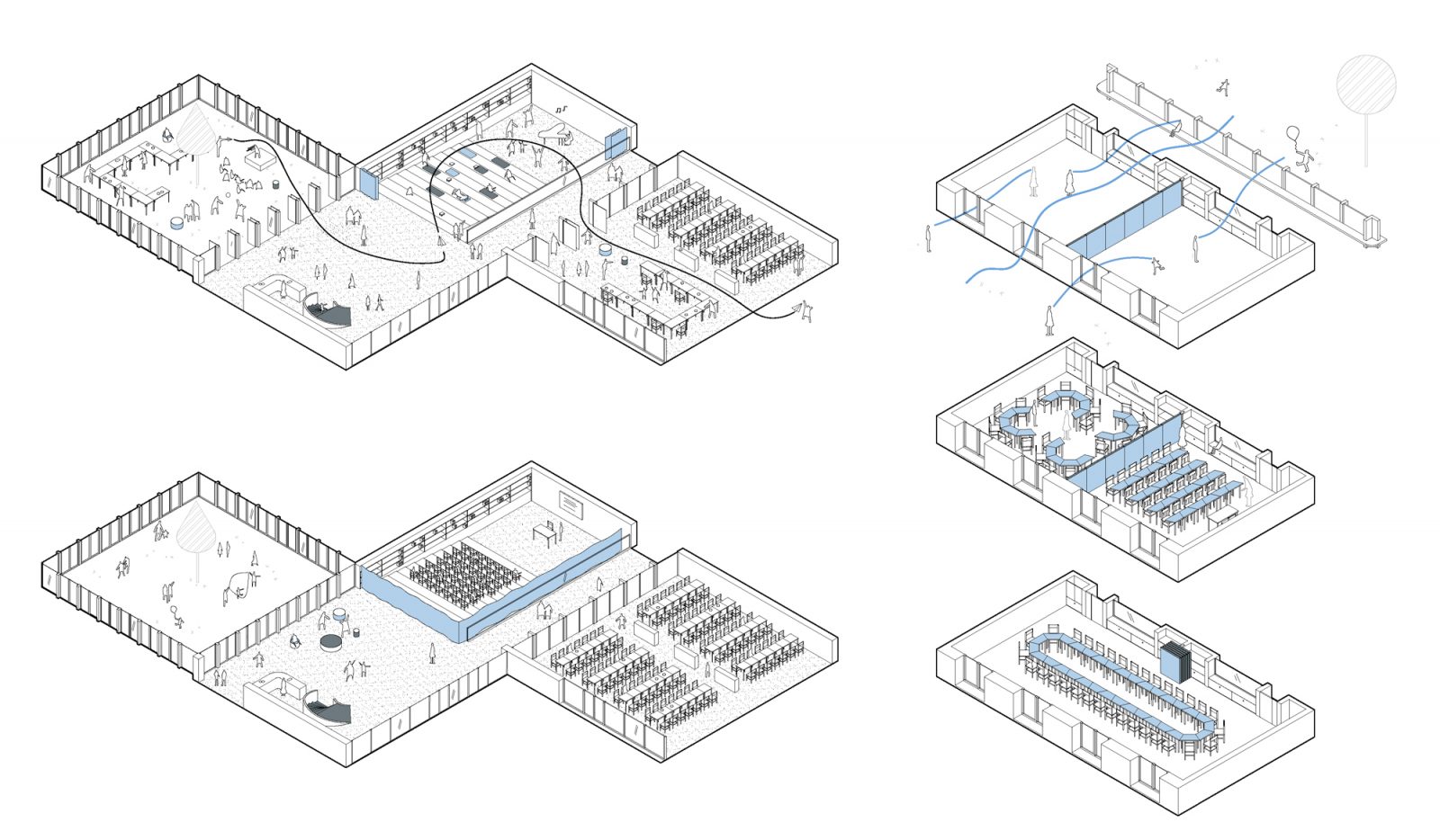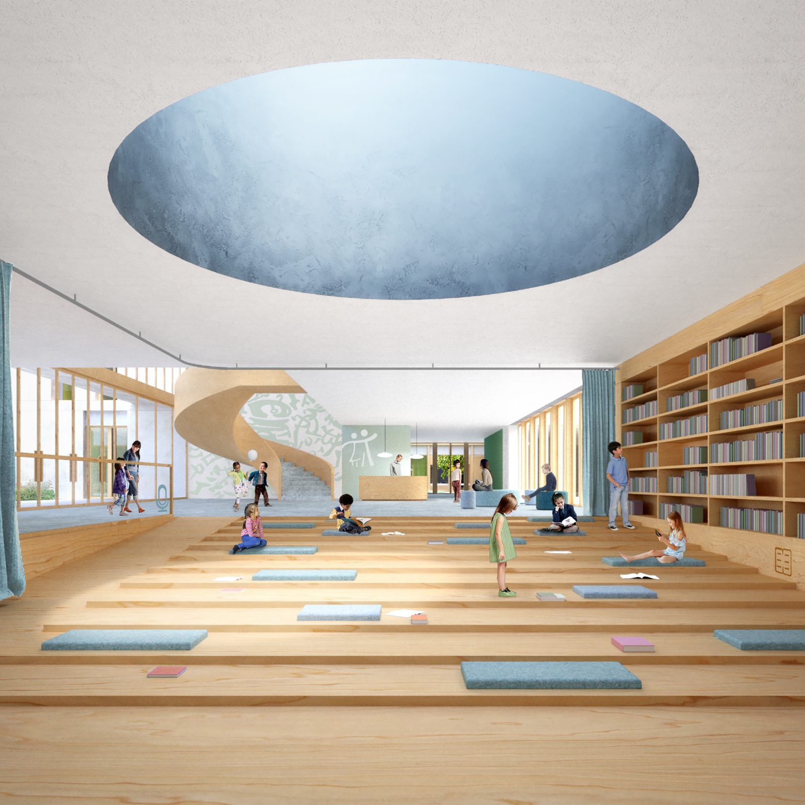 Due dei tre volumi sono svuotati da corti aperte al cielo, attorno alle quali si articolano, al piano terra, gli spazi della scuola dell’infanzia ed elementare e, al piano primo, della scuola media; il terzo quadrato ospita, alla quota d’accesso, le funzioni collettive (mensa, palestra con relativi servizi e area amministrativa), mentre alla quota del primo livello si trovano un campo da gioco e un giardino didattico a cielo aperto.