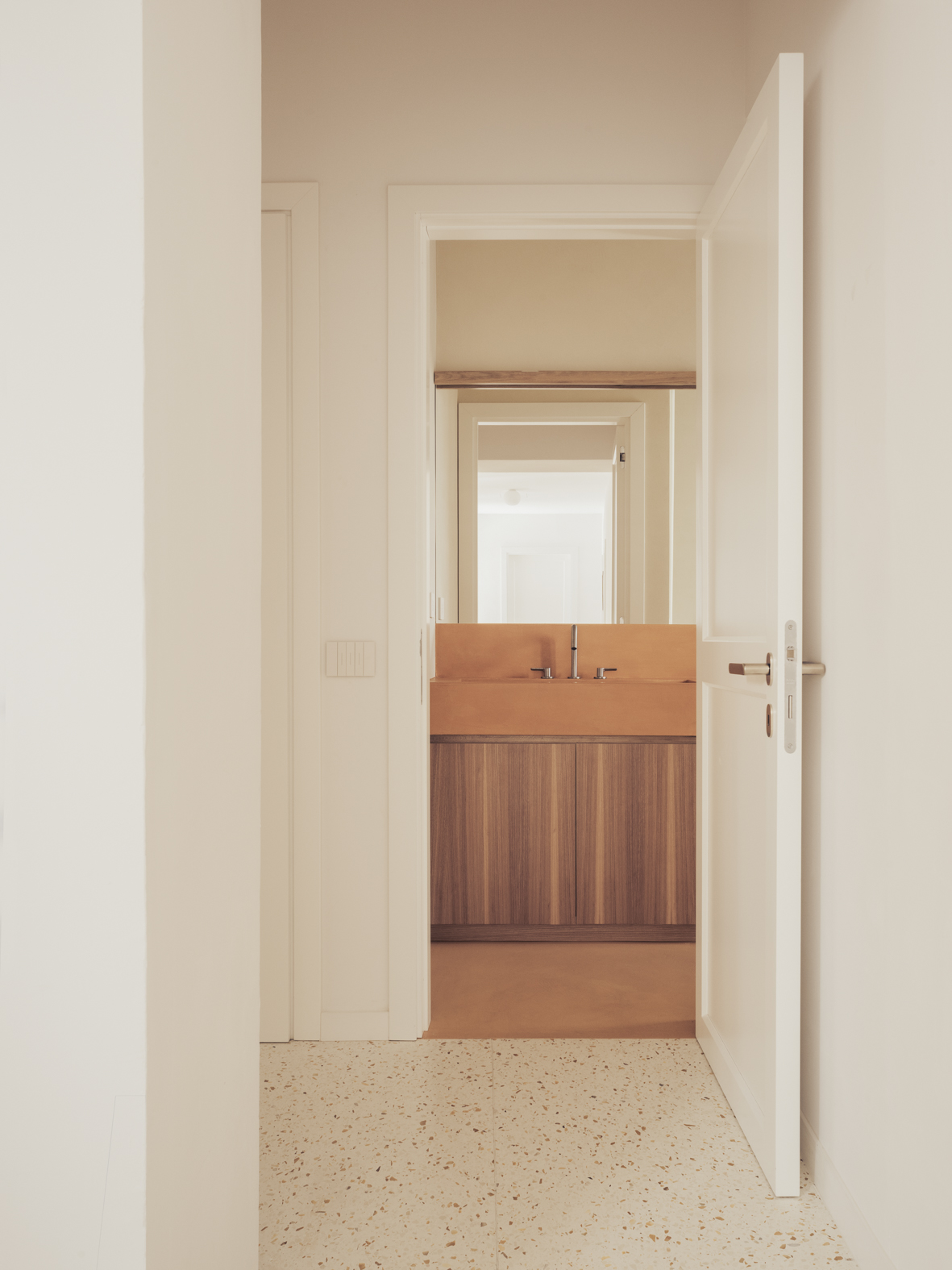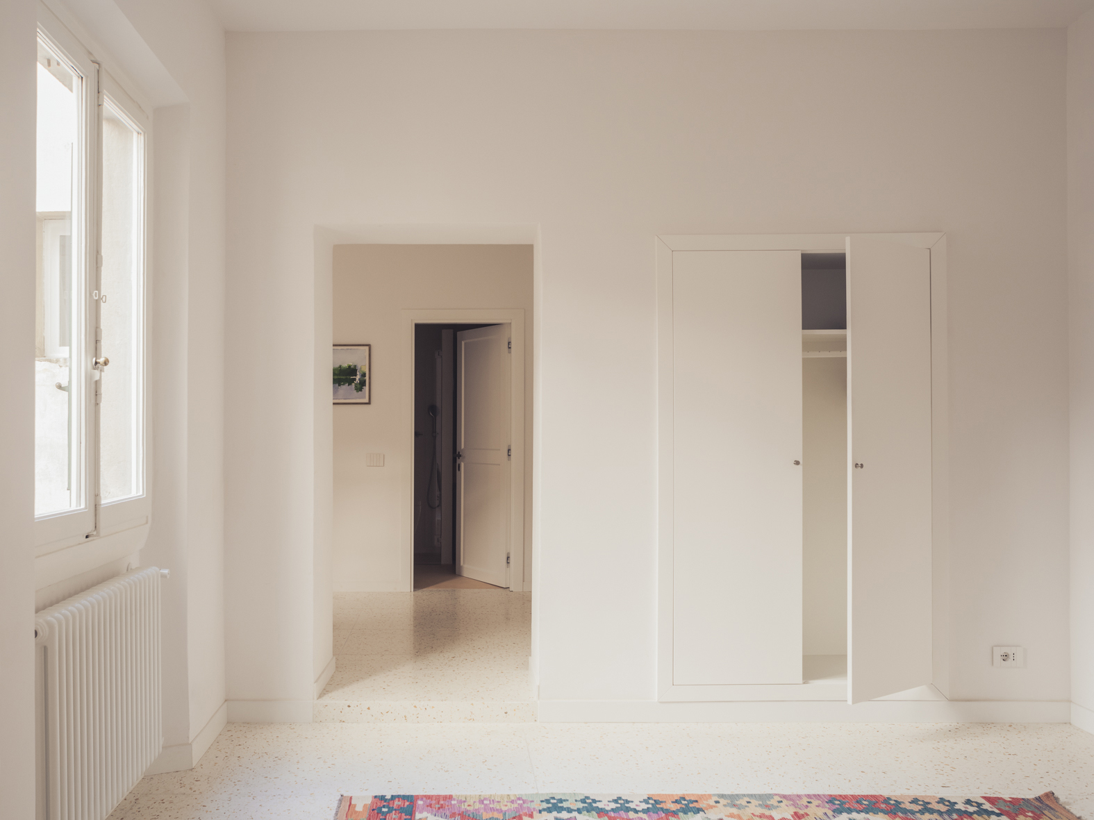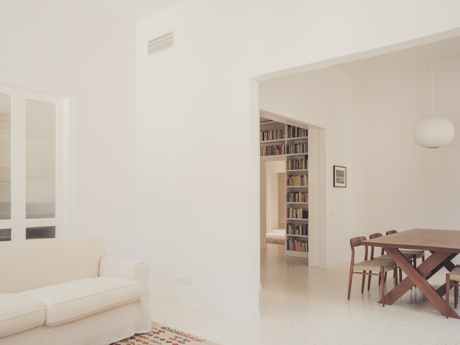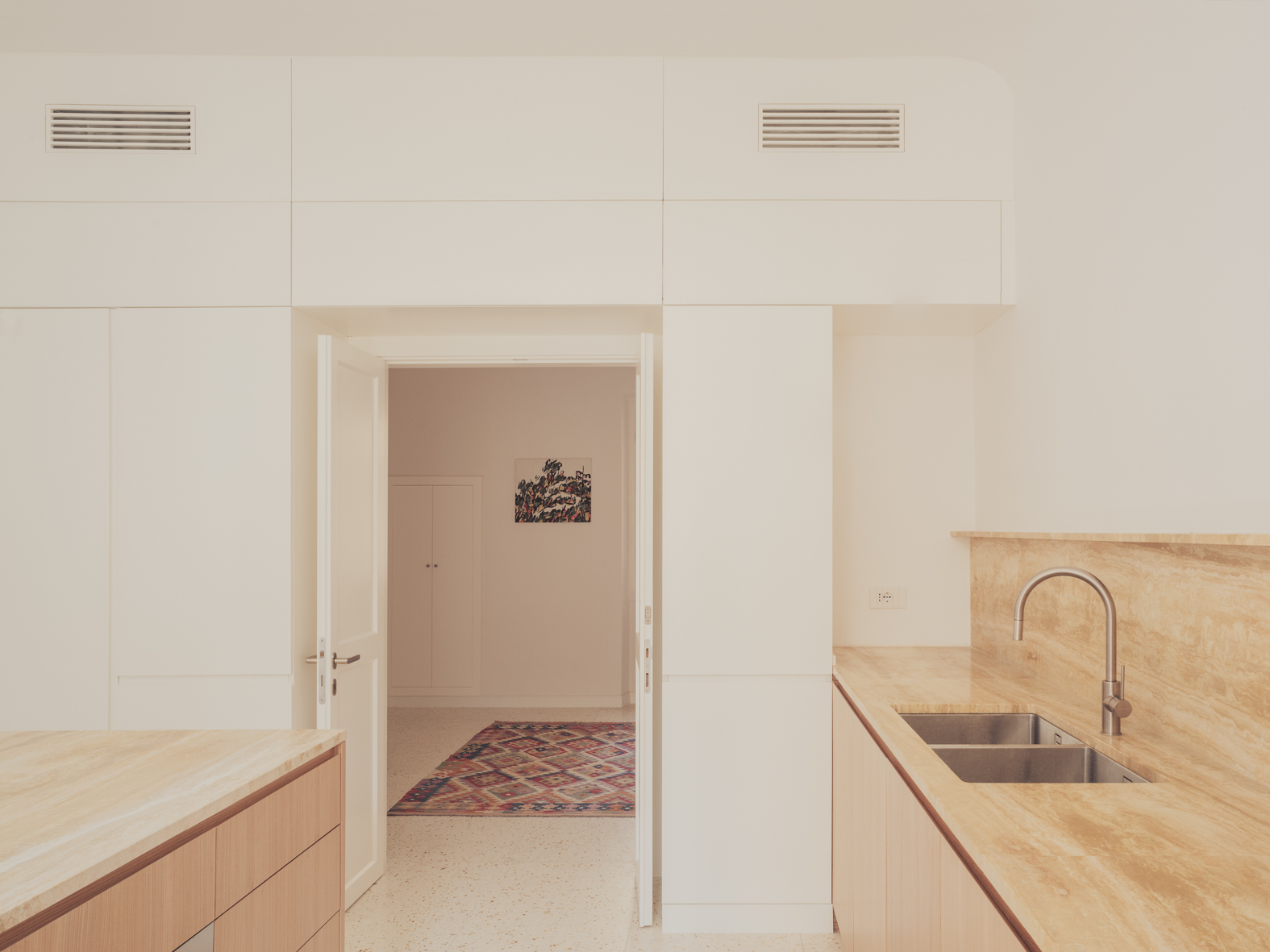 La nuova distribuzione prevede una chiara divisione tra gli ambienti della zona giorno, posizionati nelle stanze più grandi e con le visuali migliori, e della zona notte, collocati nella parte più silenziosa e raccolta della casa. La zona giorno, attraverso l’apertura di grandi varchi nelle murature esistenti, si presenta come un continuum di spazi unificati da una ristretta palette di materiali (graniglia, travertino, legno laccato, tinteggiatura). La zona notte presenta maggiore variazione nei colori e nelle materie, con pavimenti in parquet di tek per le camere da letto e microcemento e calce in toni caldi per i bagni.