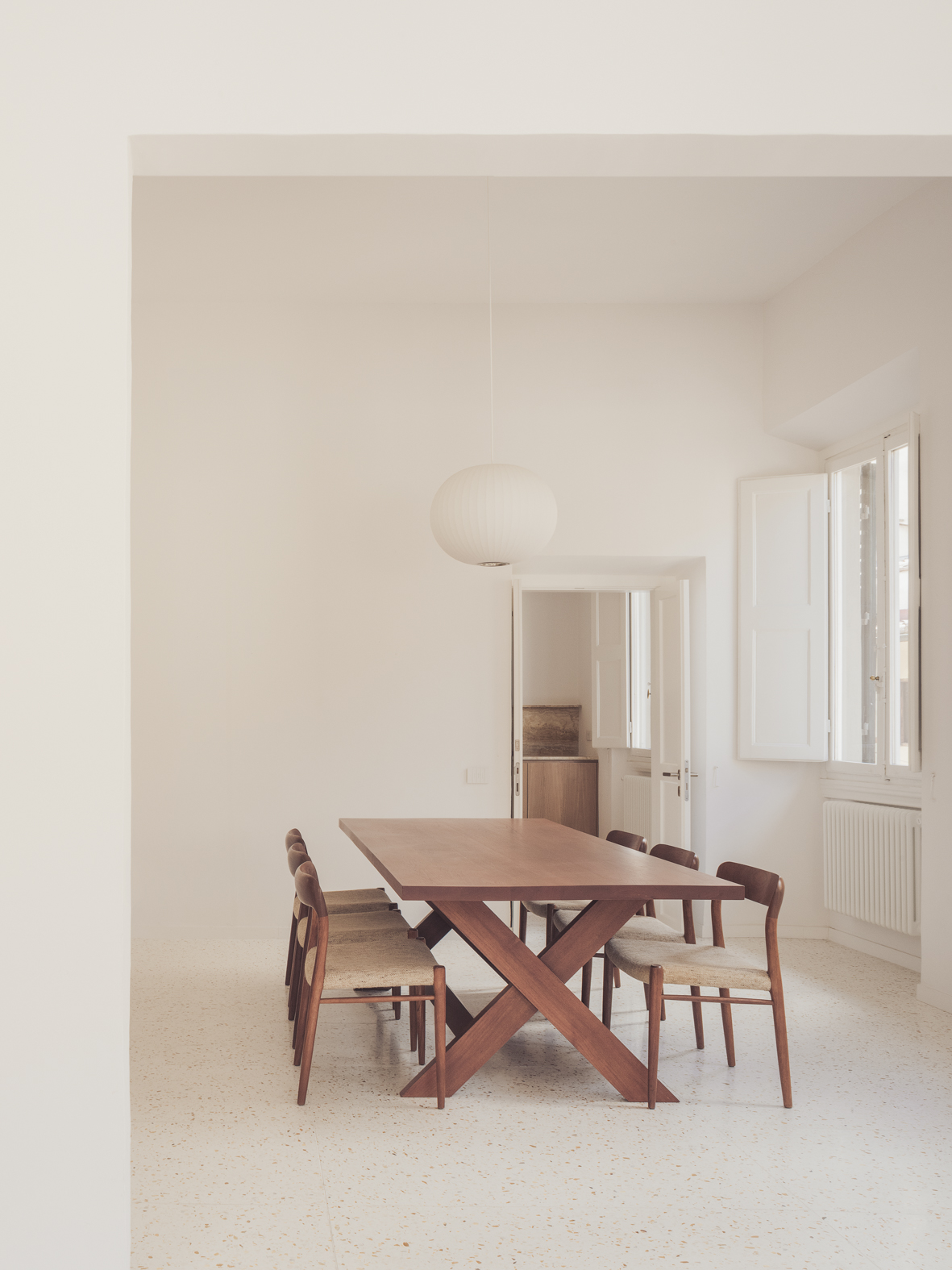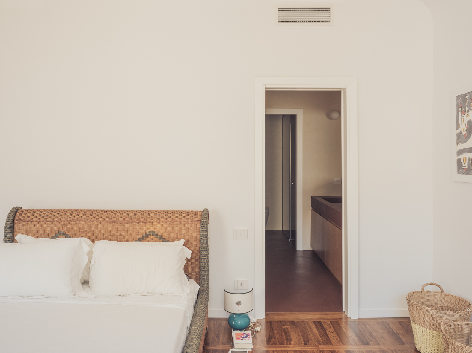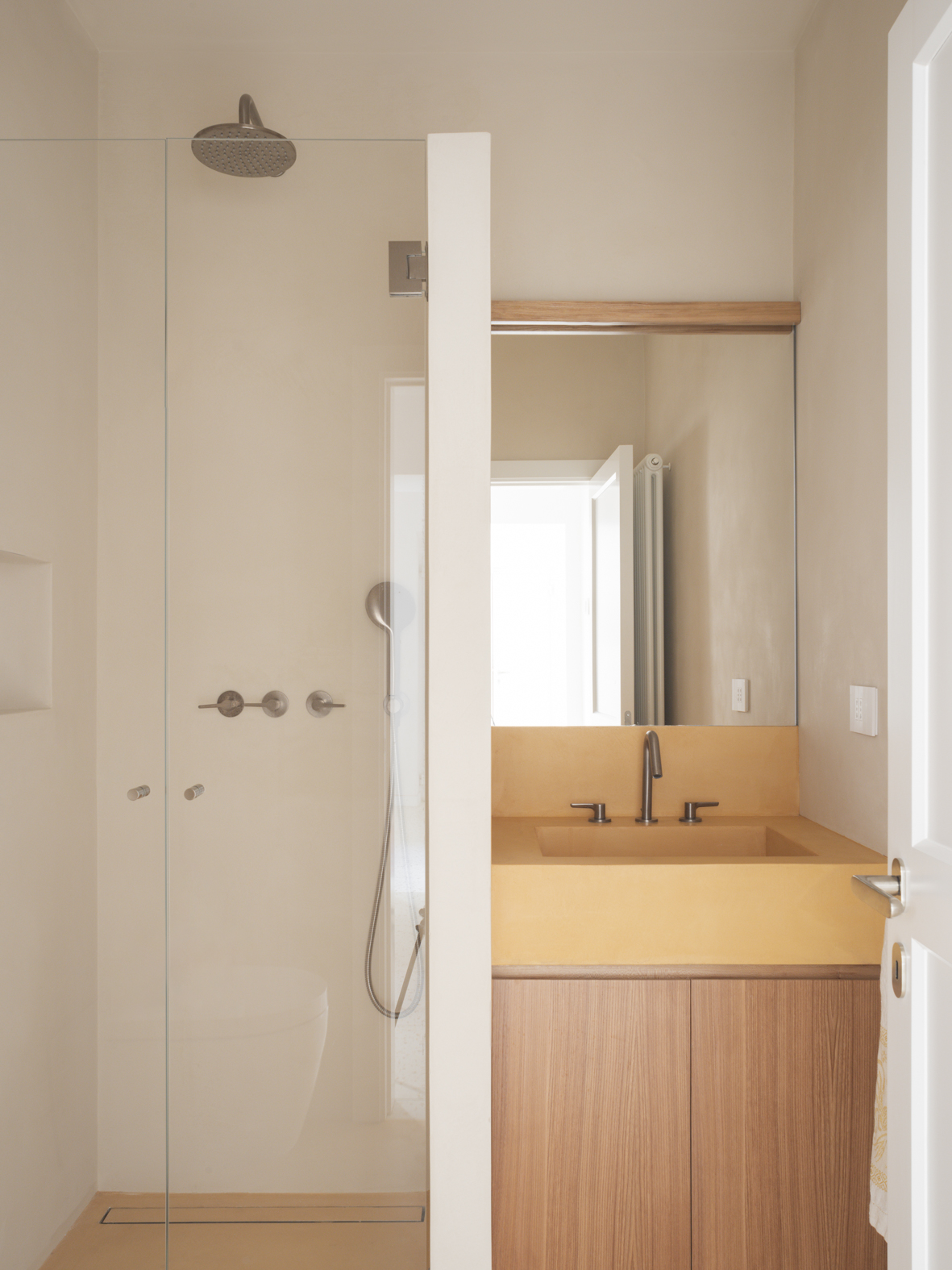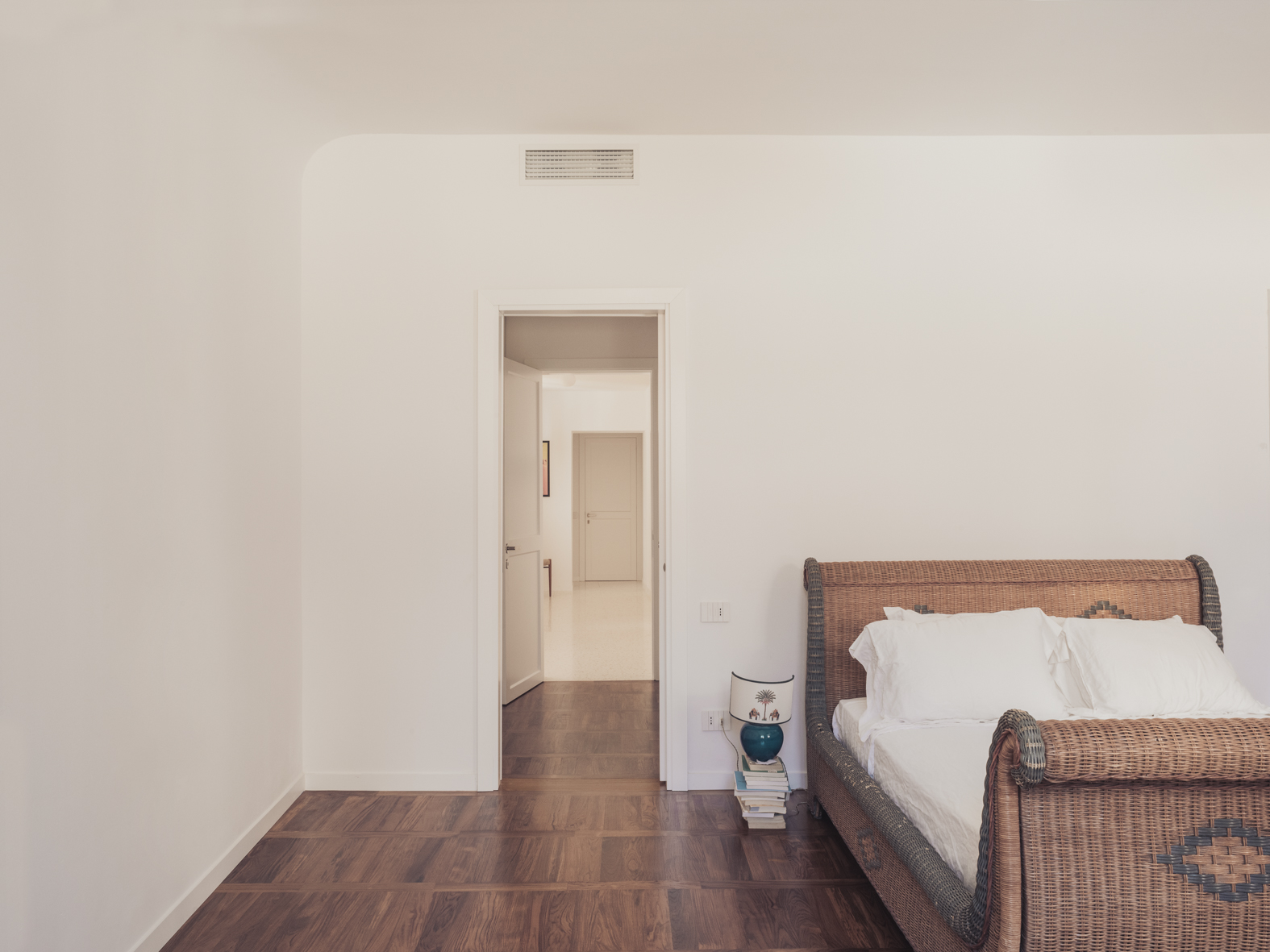 La nuova distribuzione prevede una chiara divisione tra gli ambienti della zona giorno, posizionati nelle stanze più grandi e con le visuali migliori, e della zona notte, collocati nella parte più silenziosa e raccolta della casa. La zona giorno, attraverso l’apertura di grandi varchi nelle murature esistenti, si presenta come un continuum di spazi unificati da una ristretta palette di materiali (graniglia, travertino, legno laccato, tinteggiatura). La zona notte presenta maggiore variazione nei colori e nelle materie, con pavimenti in parquet di tek per le camere da letto e microcemento e calce in toni caldi per i bagni.