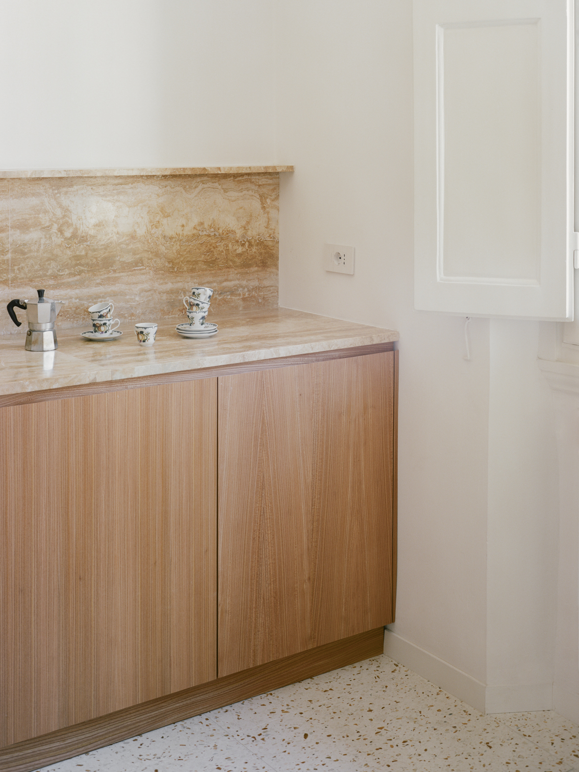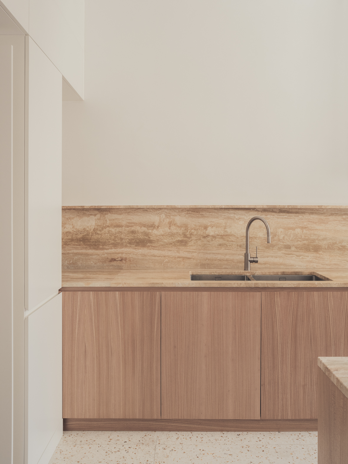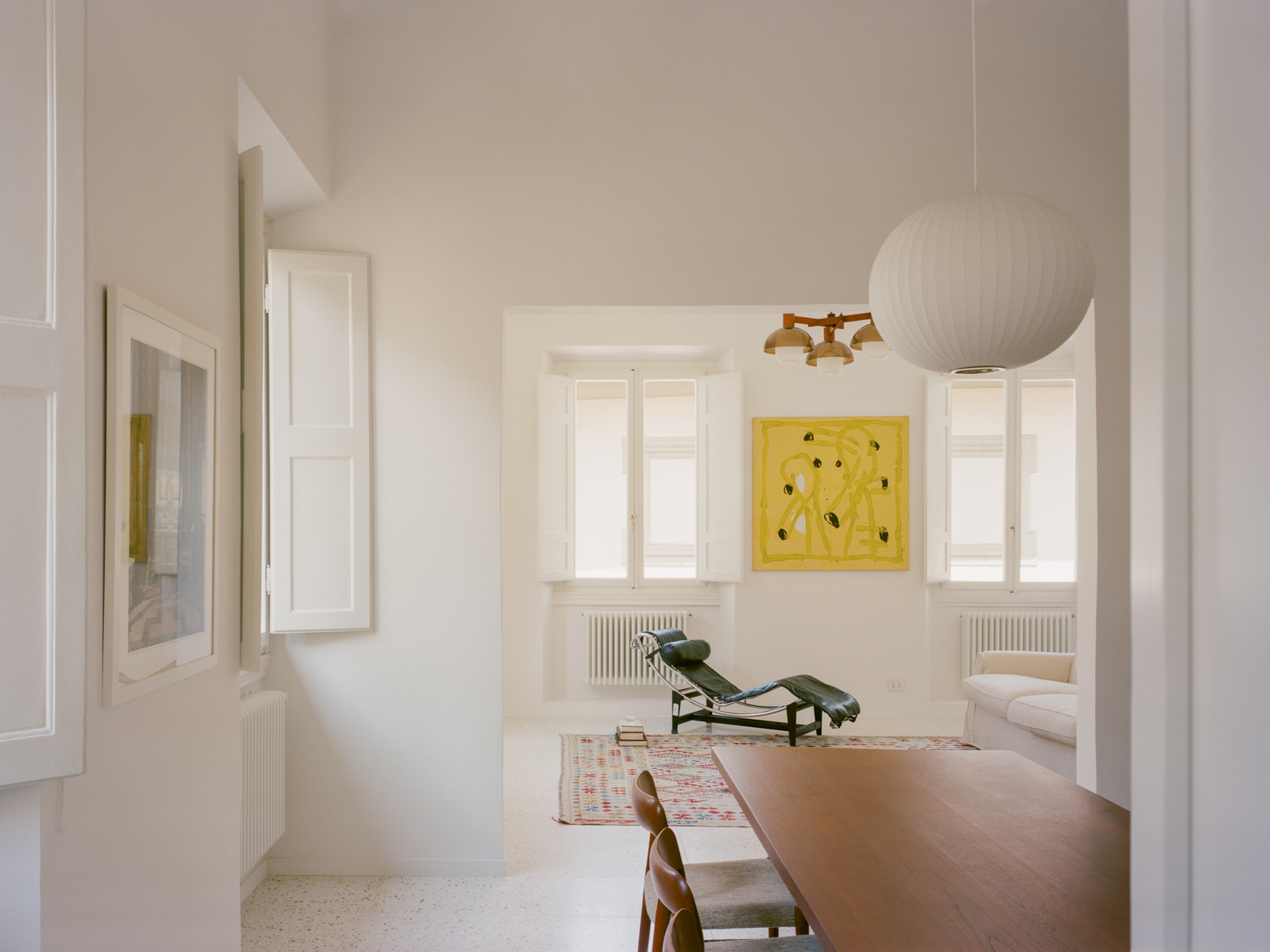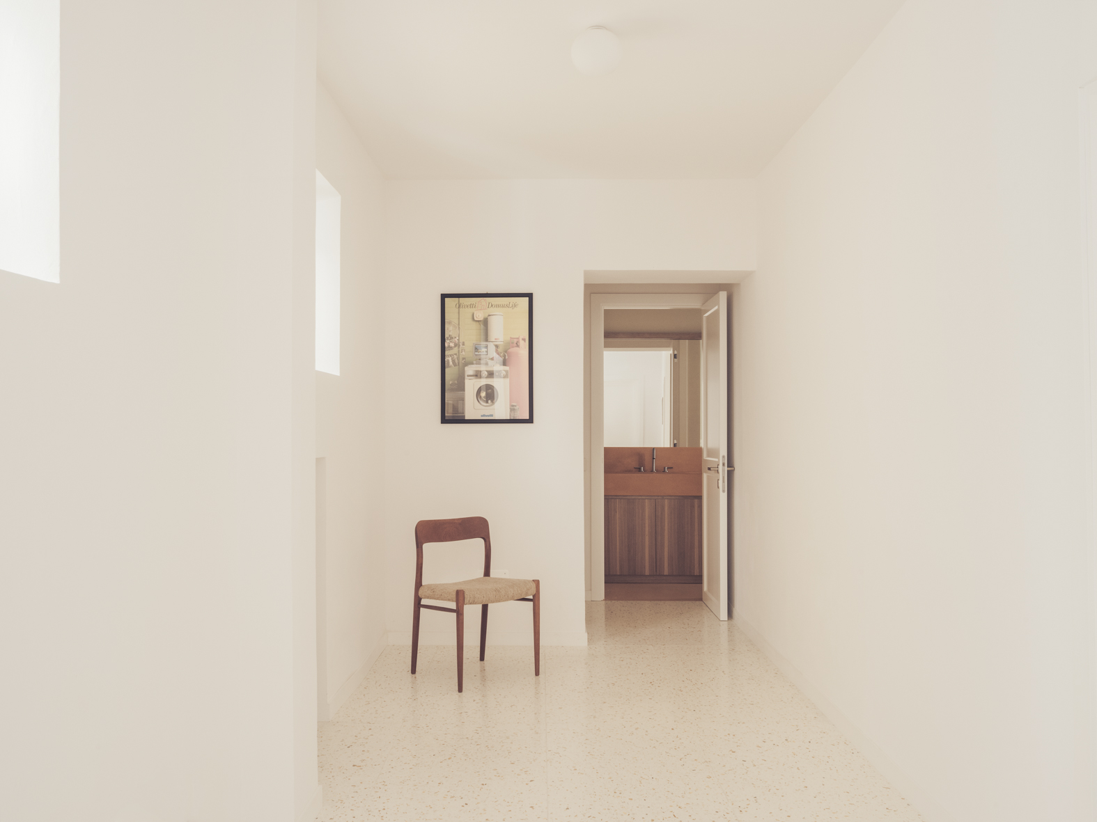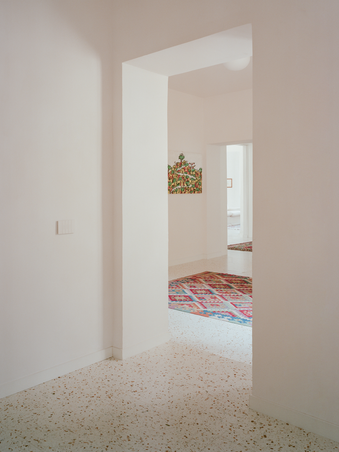La nuova distribuzione prevede una chiara divisione tra gli ambienti della zona giorno, posizionati nelle stanze più grandi e con le visuali migliori, e della zona notte, collocati nella parte più silenziosa e raccolta della casa. La zona giorno, attraverso l’apertura di grandi varchi nelle murature esistenti, si presenta come un continuum di spazi unificati da una ristretta palette di materiali (graniglia, travertino, legno laccato, tinteggiatura). La zona notte presenta maggiore variazione nei colori e nelle materie, con pavimenti in parquet di tek per le camere da letto e microcemento e calce in toni caldi per i bagni.