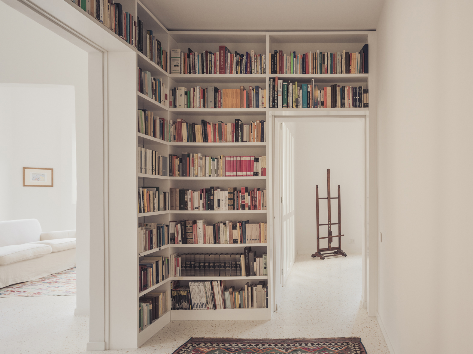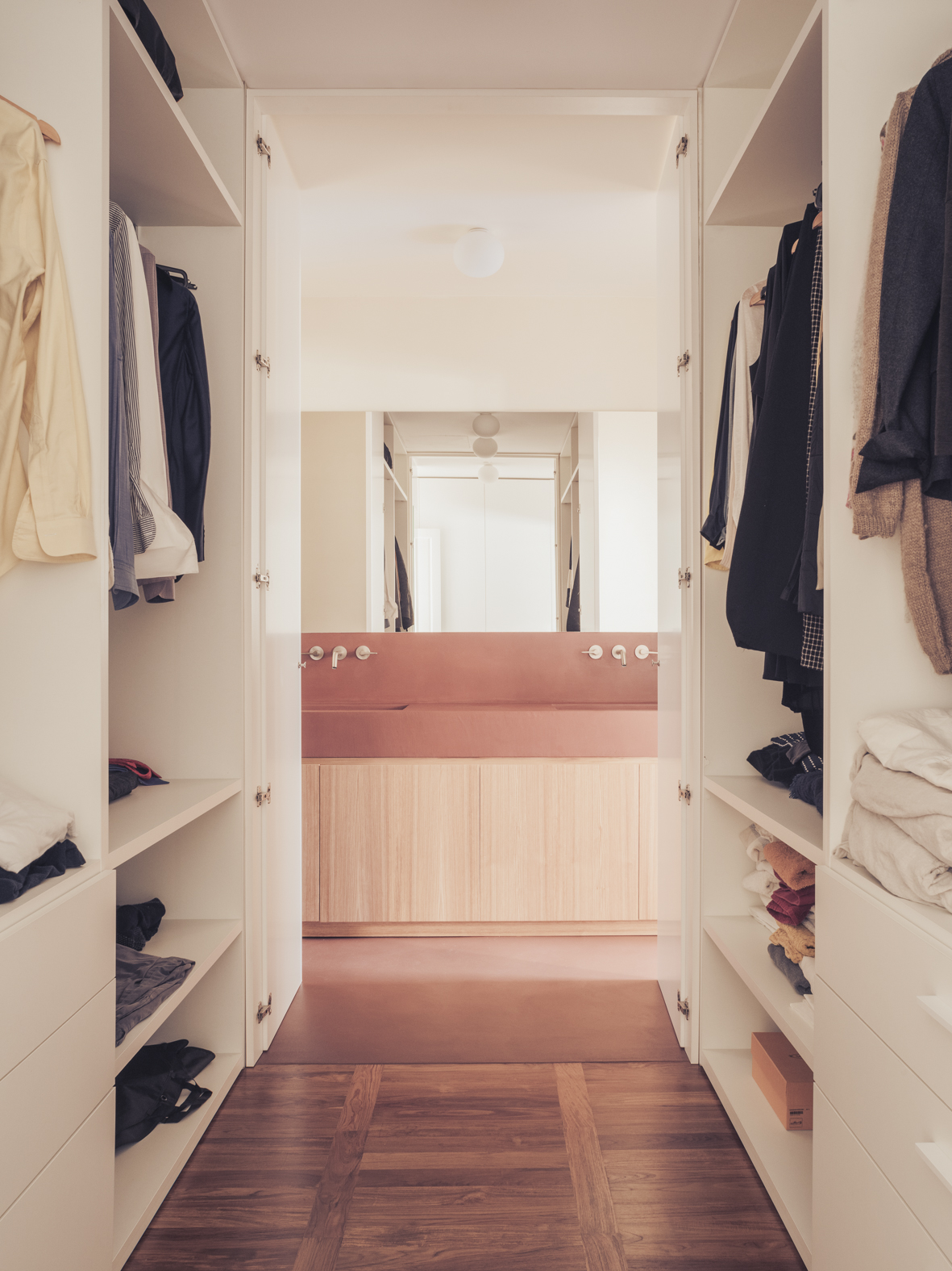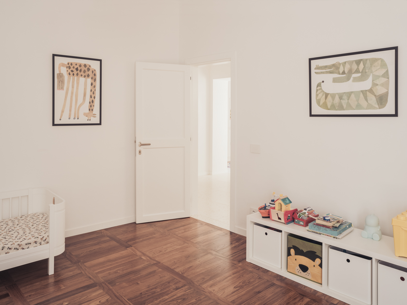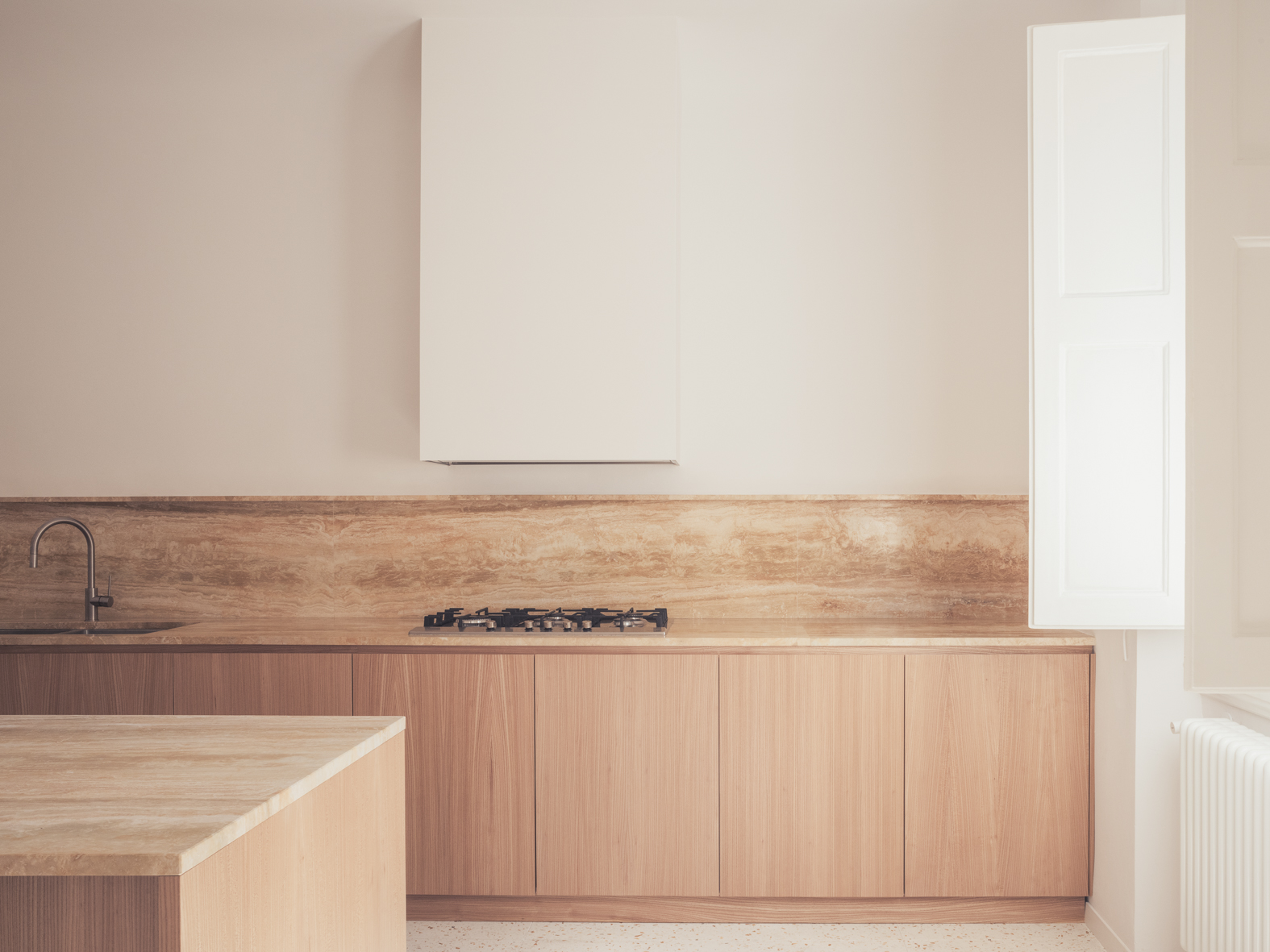 La nuova distribuzione prevede una chiara divisione tra gli ambienti della zona giorno, posizionati nelle stanze più grandi e con le visuali migliori, e della zona notte, collocati nella parte più silenziosa e raccolta della casa. La zona giorno, attraverso l’apertura di grandi varchi nelle murature esistenti, si presenta come un continuum di spazi unificati da una ristretta palette di materiali (graniglia, travertino, legno laccato, tinteggiatura). La zona notte presenta maggiore variazione nei colori e nelle materie, con pavimenti in parquet di tek per le camere da letto e microcemento e calce in toni caldi per i bagni.