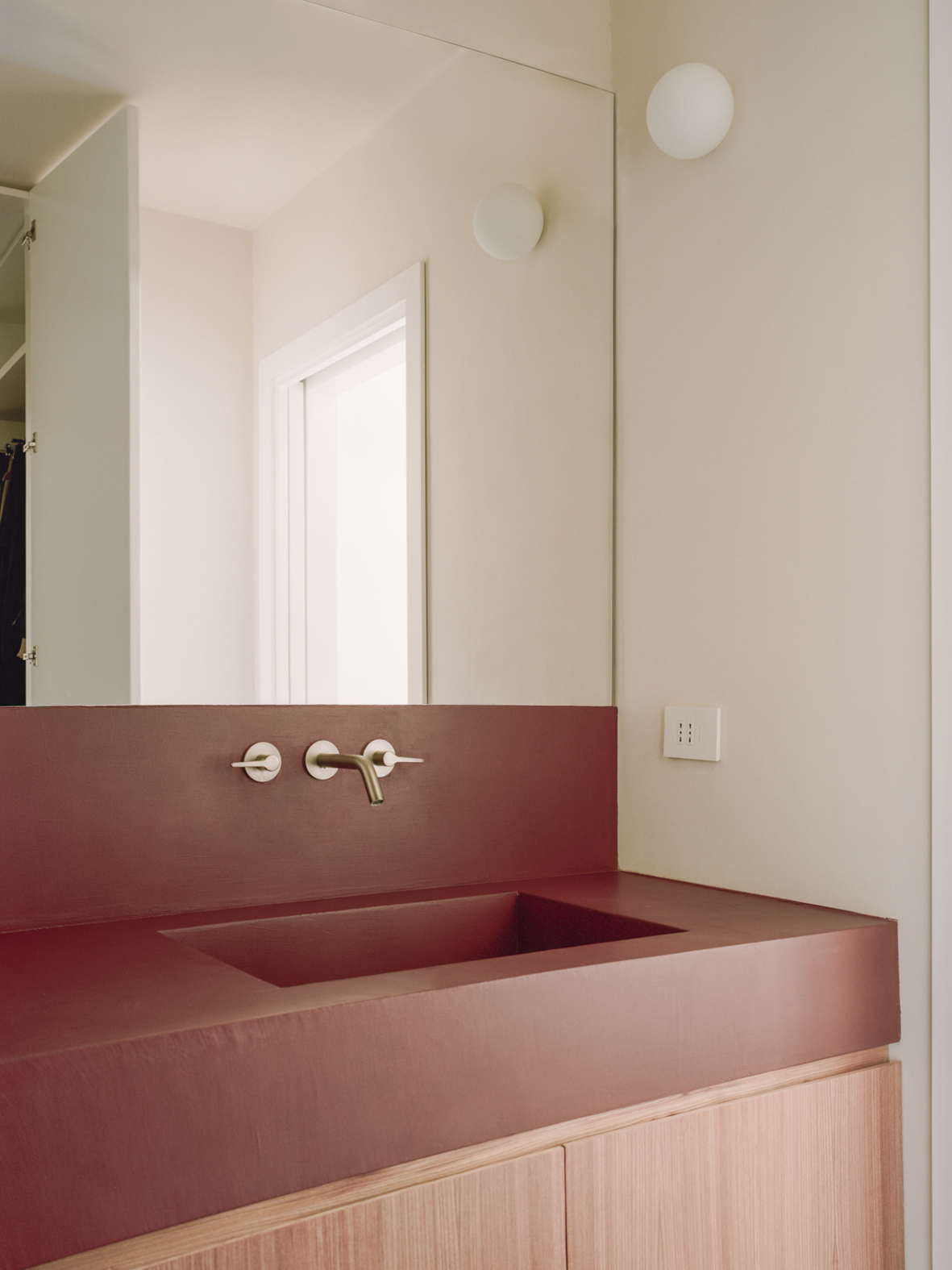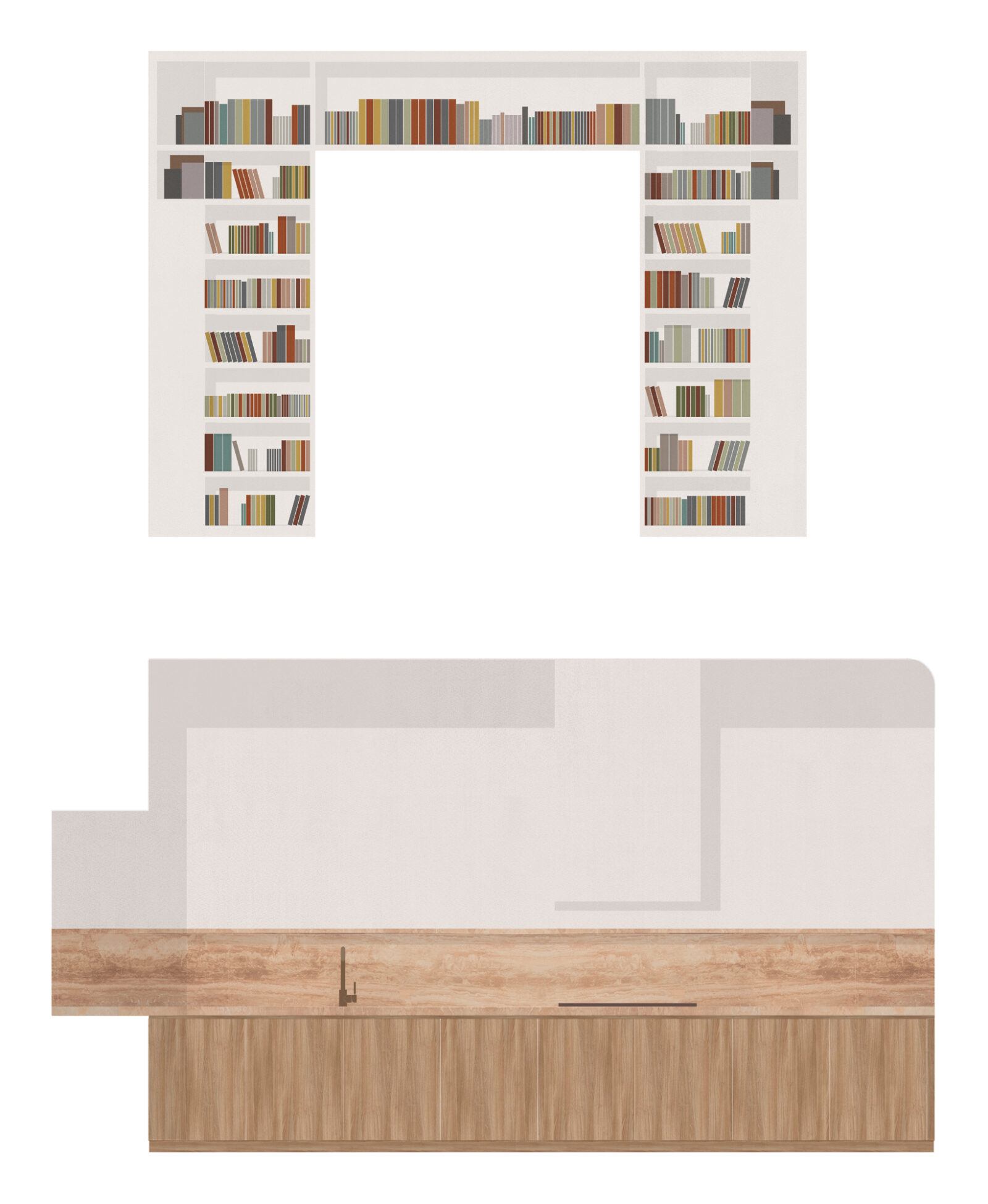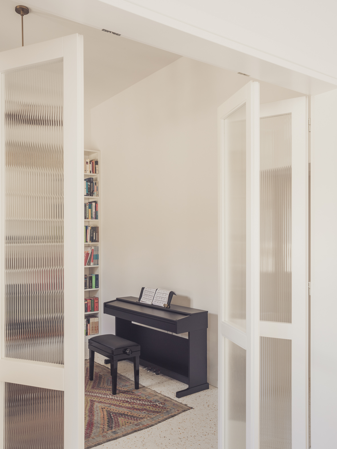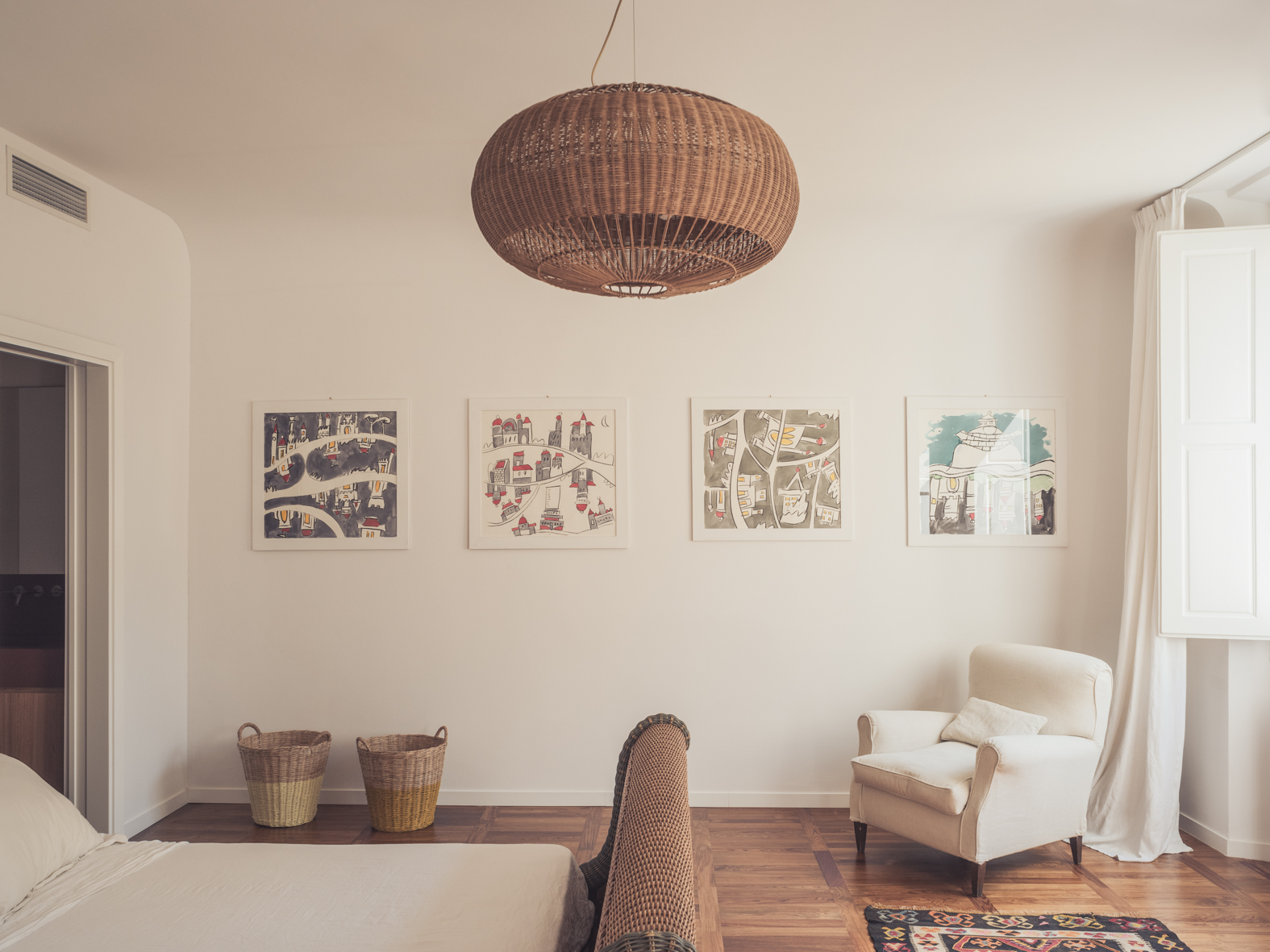 La nuova distribuzione prevede una chiara divisione tra gli ambienti della zona giorno, posizionati nelle stanze più grandi e con le visuali migliori, e della zona notte, collocati nella parte più silenziosa e raccolta della casa. La zona giorno, attraverso l’apertura di grandi varchi nelle murature esistenti, si presenta come un continuum di spazi unificati da una ristretta palette di materiali (graniglia, travertino, legno laccato, tinteggiatura). La zona notte presenta maggiore variazione nei colori e nelle materie, con pavimenti in parquet di tek per le camere da letto e microcemento e calce in toni caldi per i bagni.
